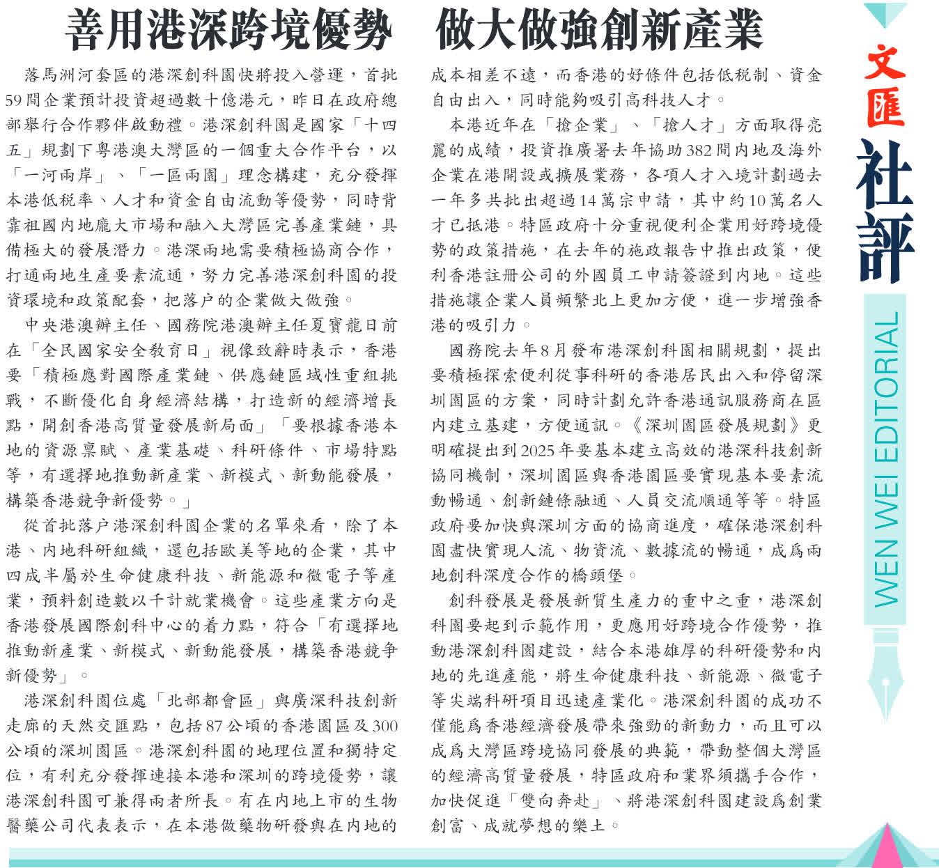 創科發展是發展新質生產力的重中之重,港深創科園要起到示範作用,更應用好跨境合作優勢,推動港深創科園建設,結合本港雄厚的科研優勢和內地的先進產能,將生命健康科技、新能源、微電子等尖端科研項目迅速產業化。港深創科園的成功不僅能為香港經濟發展帶來強勁的新動力,而且可以成為大灣區跨境協同發展的典範,帶動整個大灣區的經濟高質量發展,特區政府和業界須攜手合作,加快促進「雙向奔赴」、將港深創科園建設為創業創富、成就夢想的樂土。