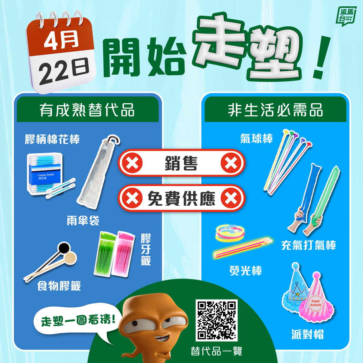 大公文匯全媒體報道,管制即棄塑膠新法例下星期一(22日)開始實施,屆時食肆、零售店和酒店賓館會從源頭減廢,銷售或供應即棄膠餐具和其他塑膠產品將受到管制。政府今日(19日)在社交專頁「添馬台」發帖,以多圖及掃碼二維碼形式介紹走塑詳情和替代品資料,呼籲市民為「走塑」生活做好準備。