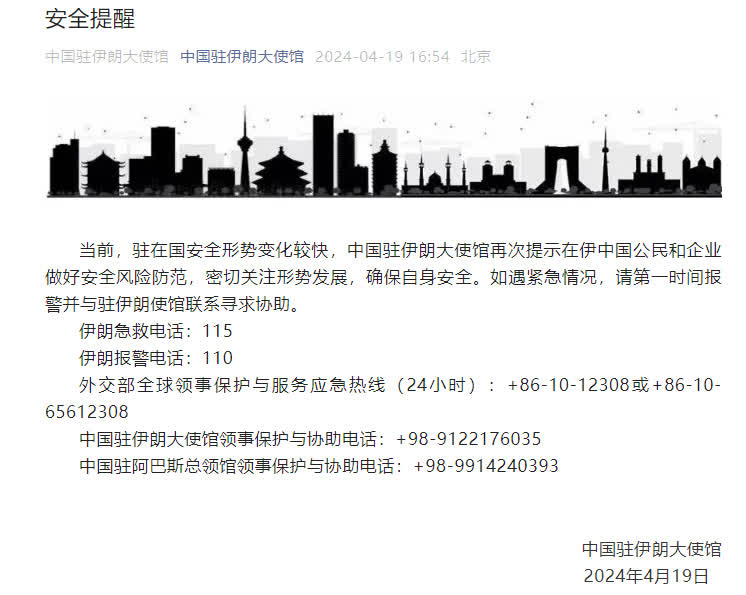 大公文匯網報道,中國駐伊朗大使館官微4月19日發布安全提醒:當前,駐在國安全形勢變化較快,中國駐伊朗大使館再次提示在伊中國公民和企業做好安全風險防範,密切關注形勢發展,確保自身安全。如遇緊急情況,請第一時間報警並與駐伊朗使館聯繫尋求協助。