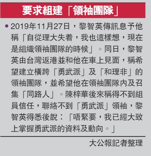 控方展示陳梓華與黎智英於2020年1月10至11日的私人訊息,陳梓華提到劉祖廸正前往台北,未能跟施明德會面,黎智英指示陳梓華等人可早到其陽明山別墅詳談,其後陳梓華、劉祖廸、黎智英及一名林姓女子,於2020年1月11日在別墅午飯會面。根據《大公報》2021年2月22日的報道,黎智英位於台北陽明山的豪宅,毗鄰美國在台協會官邸,是黎在台北的重要居所。