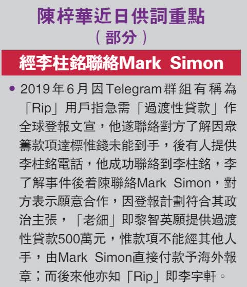 陳梓華供稱,黎智英希望通過爭取國際上的禁運、制裁和施壓,以實現中國政治、經濟上的崩塌,並引入美式民主。陳確認黎智英2019年11月首次提出「初選」概念,又希望培養劉祖迪成為政治明星,可以在生活上給予劉一萬英鎊的資助。