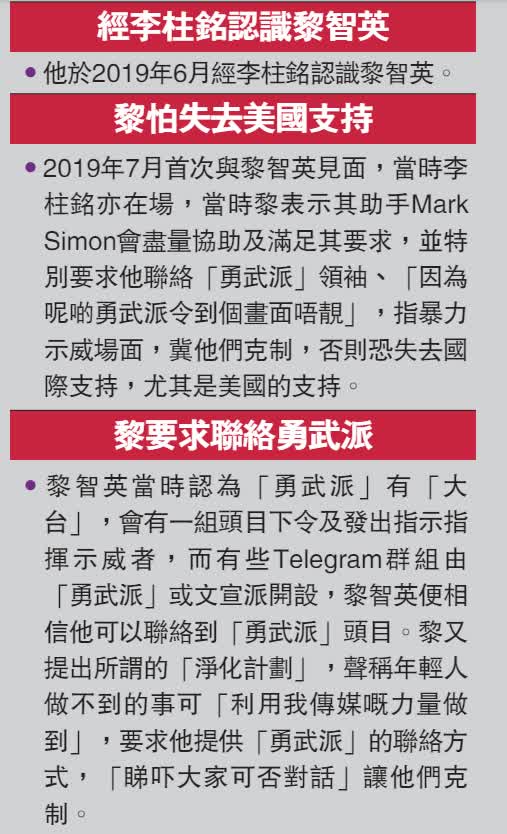 黎智英又在席上闡述了國際游說的四個步驟。陳梓華供述,黎不認同陳等人的做法,提出首先要向外國政府傳遞香港的信息,再呼籲國際關注及譴責。第三步要將外國的想法帶回香港,確保香港人知道「外國政府沒有離棄或者忽視他們」。最後與「枱底人」,即外國政治顧問和外國政策規劃者建立關係,影響他們的對華政策,「推動制裁,甚至將來可以推翻中共」。