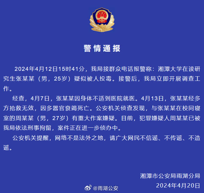 大公文匯網報道,關於網傳「湘潭大學有學生被投毒死亡」,4月20日凌晨,湖南省湘潭市公安局雨湖分局發布警情通報稱,4月12日15時41分,該局接群眾電話報警稱:湘潭大學在讀研究生張某某(男,25歲)疑似被人投毒。接警後,該局立即開展調查工作。