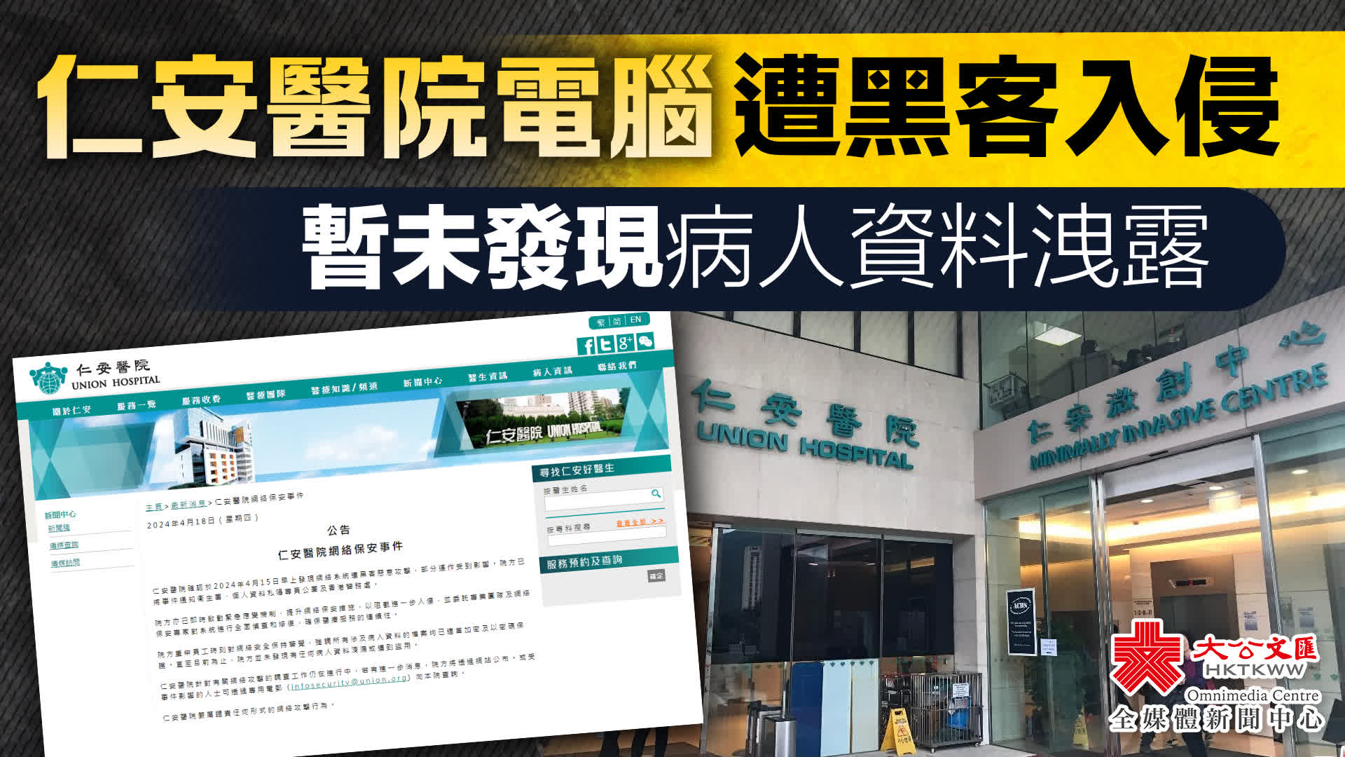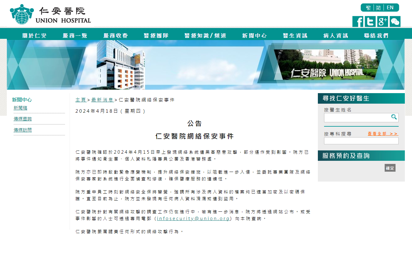 據仁安醫院4月18日公告稱,醫院確認於2024年4月15日早上發現網絡系統遭黑客惡意攻擊,部分運作受到影響。醫院已將事件通知衞生署、個人資料私隱專員公署及香港警務處,亦已即時啟動緊急應變機制,提升網絡保安措施,以阻截進一步入侵,並委託專業團隊及網絡保安專家對系統進行全面偵查和修復,確保醫療服務的連續性。