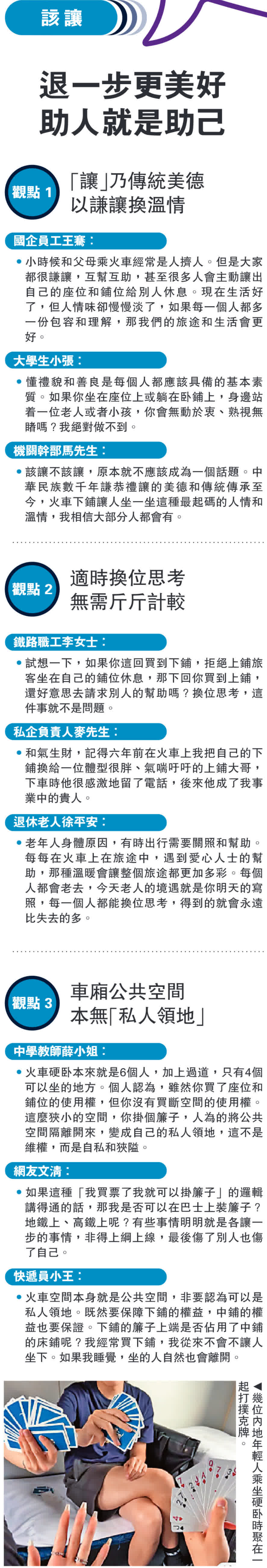 (大公報記者 李陽波)近日,內地網絡上一段拍攝於火車卧鋪車廂的視頻引發網民熱議。片中一位老人抱怨幾位年輕人在硬卧車廂的下鋪鋪位上掛了床簾,把下鋪變成了「獨立空間」,自己原本想坐在下鋪休息卻無從落腳。不少網友認為,幾位年輕人花錢購買了下鋪,就擁有完全的使用權,老人的抱怨是圖自己方便,完全不講道理。但也有網友表示,上鋪和中鋪旅客「習慣性」到下鋪休息,是多年來形成的人情默契,況且謙恭禮讓本就是中華傳統美德。火車上最「搶手」的下鋪,究竟應不應該「共享」?還是說,「讓你坐是情分,不讓你坐也是本分」?