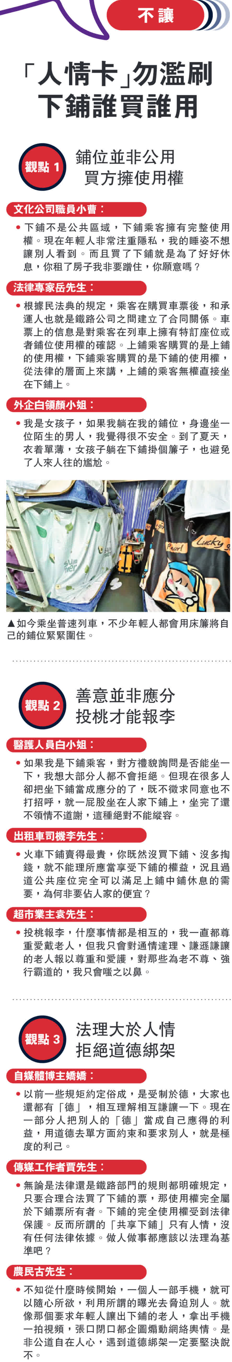 黨輝表示,讓是一種愛心,不讓也沒做錯。如果上鋪或中鋪的旅客需要去下鋪休息,不妨禮貌地和下鋪乘客先行協商。如果對方拒絕,應自行另想辦法,而非不依不饒;如果對方同意,使用下鋪也應適度,不能無休無止。另一方面,乘客間應該禮尚往來,如果其他鋪位的人想要使用下鋪,也可以考慮以零食、飲料等作為酬謝。