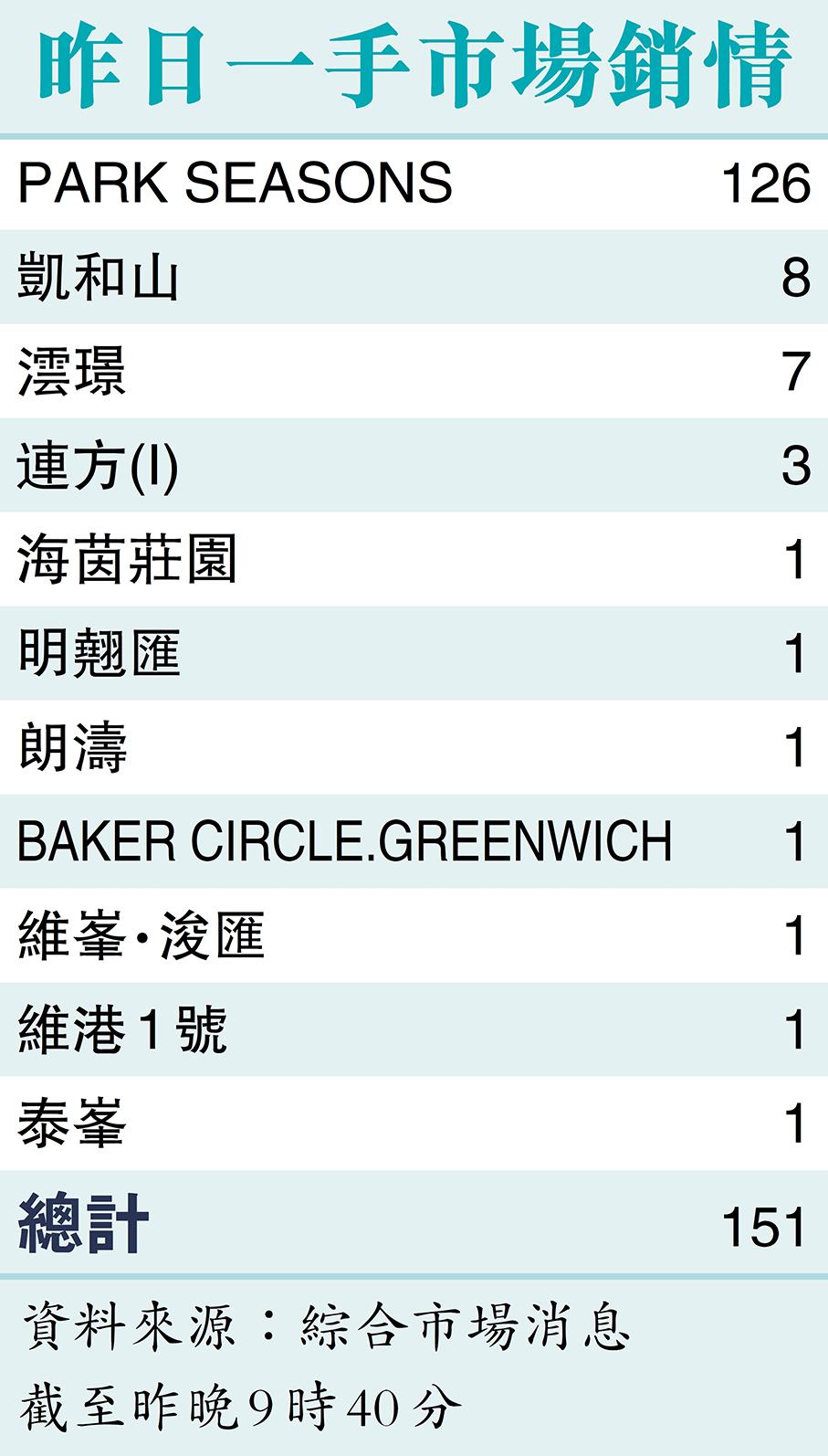 (香港文匯報記者 黎梓田)香港發展商趁樓市轉旺爭相推出新盤,昨日至少有453個一手單位發售。會德豐地產與港鐵合作發展的將軍澳日出康城12B期PARK SEASONS昨日(20日)開售168伙,當中1房入場費454.1萬元。當中不乏內地買家,更有大手內地客「一客五食」,斥資約2,000萬元連掃5個1房單位。市場消息指,截至昨日傍晚,項目已售出126伙,佔推售的168伙的75%。