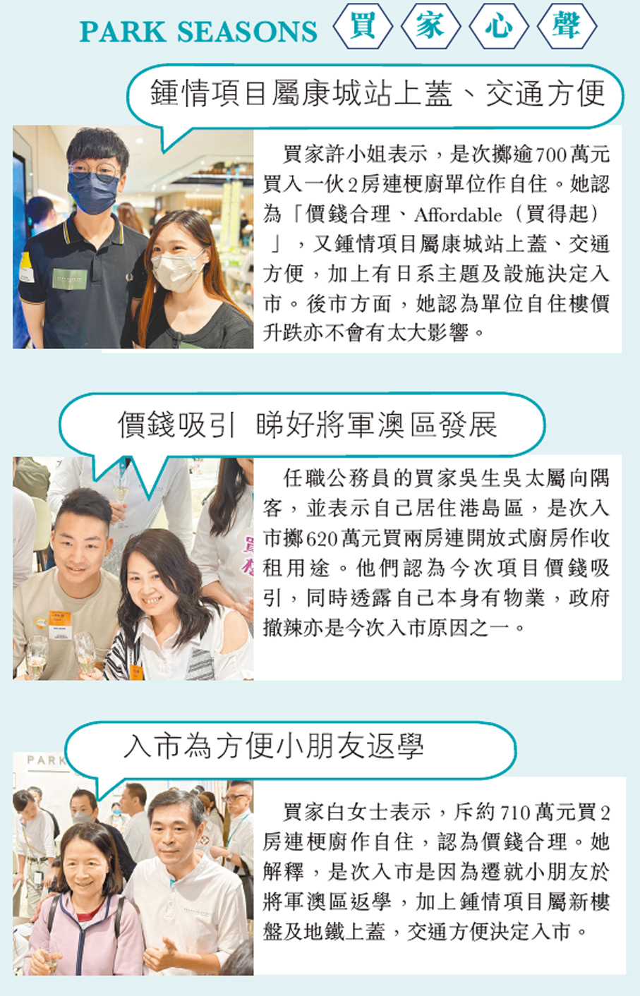 根據PARK SEASONS售樓處現場所見,昨早上10點45分項目售樓處外已有大批準買家排隊,至少有數十組買家,有不少均為年輕買家。項目早前截收4,000認購登記,以首輪發售168伙計,超購近23倍。會德豐地產主席梁志堅表示,本港樓市時間需要「慢慢上」,集團將全年銷售目標調升至200億元,最快下月推灣仔春園街項目。