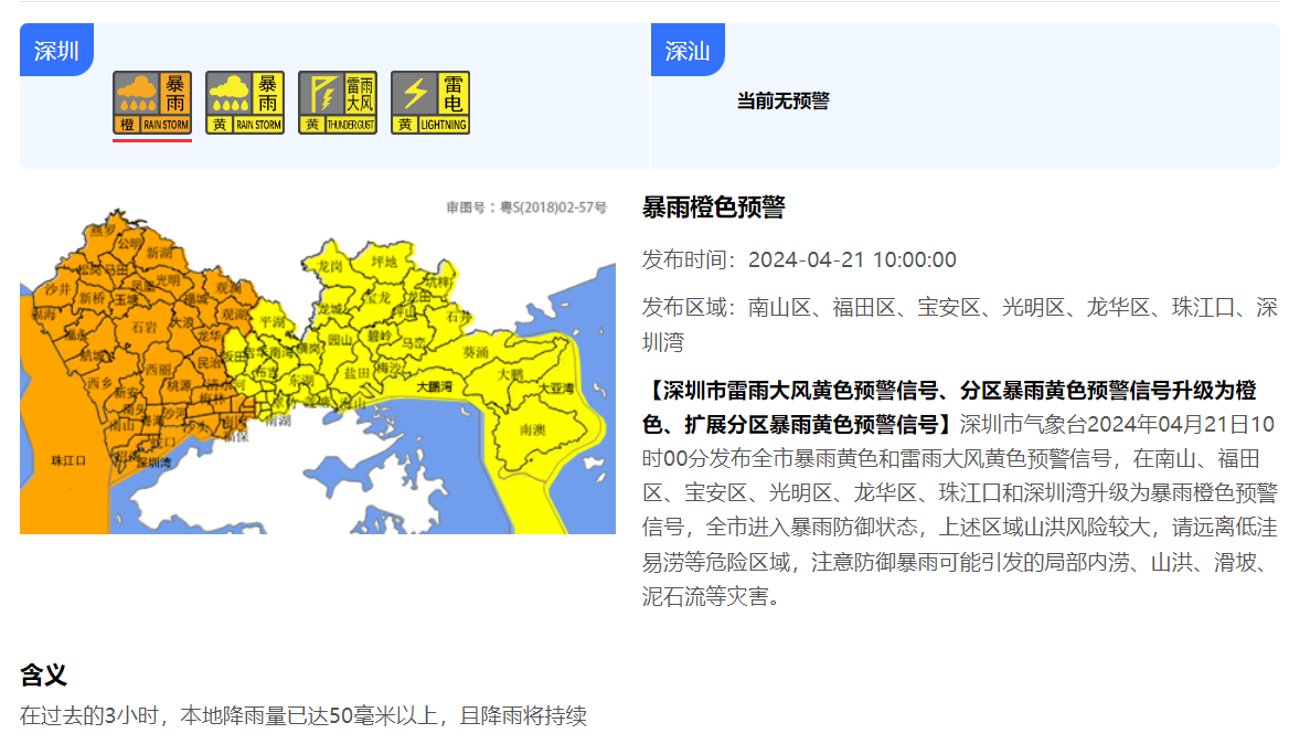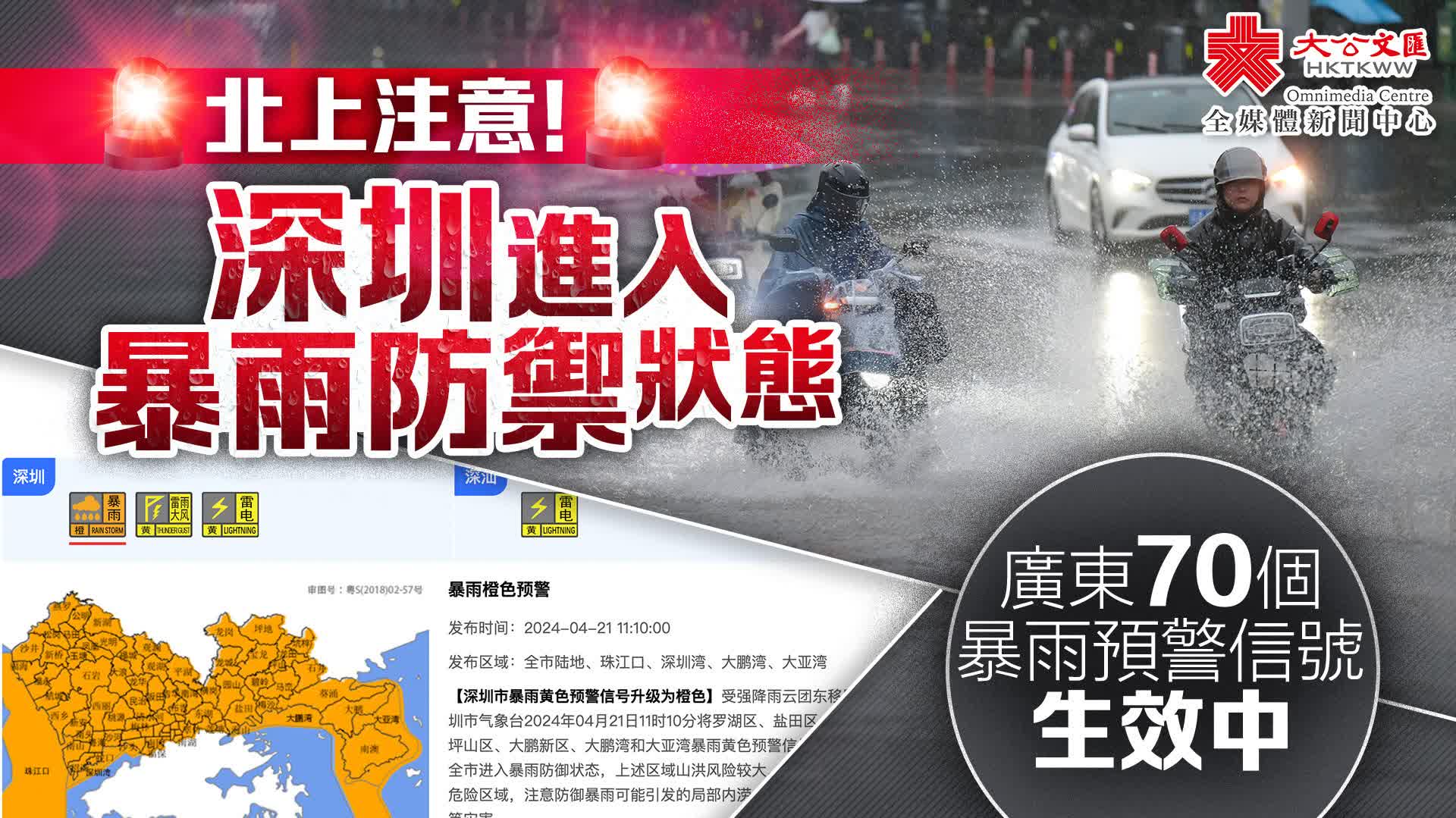 大公文匯全媒體報道,北上港人注意!深圳市氣象台今日(4月21日)10時發布全市暴雨黃色和雷雨大風黃色預警信號,在南山、福田區、寶安區、光明區、龍華區、珠江口和深圳灣升級為暴雨橙色預警信號,全市進入暴雨防禦狀態,上述區域山洪風險較大,請遠離低窪易澇等危險區域,注意防禦暴雨可能引發的局部內澇、山洪、滑坡、泥石流等災害。
