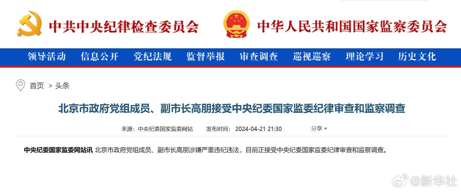 中央紀委國家監委網站今日(21日)公布,北京市政府黨組成員、副市長高朋涉嫌嚴重違紀違法,目前正接受中央紀委國家監委紀律審查和監察調查。