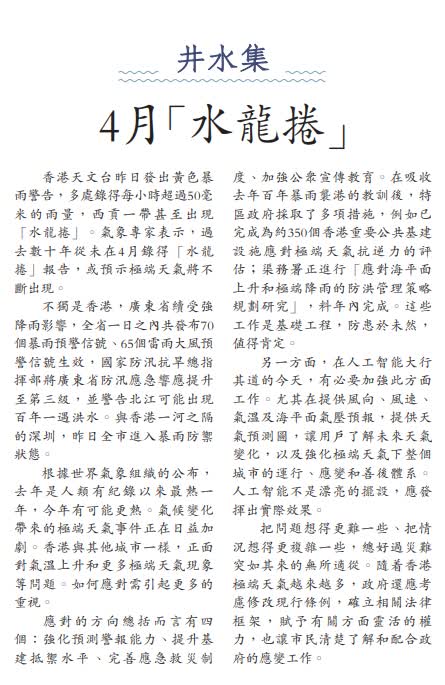 把問題想得更難一些、把情況想得更複雜一些,總好過災難突如其來的無所適從。隨着香港極端天氣越來越多,政府還應考慮修改現行條例,確立相關法律框架,賦予有關方面靈活的權力,也讓市民清楚了解和配合政府的應變工作。