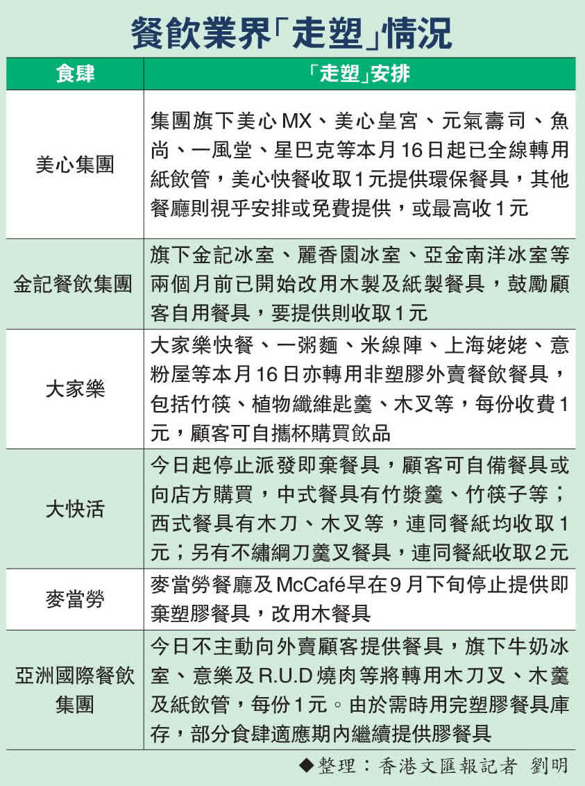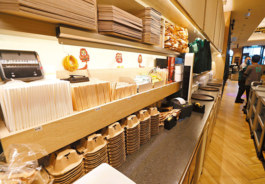 不少餐飲集團積極配合新法例的實施,向外賣食物的顧客提供木製、竹製和紙製等環保餐具,但也會額外收取1元費用。