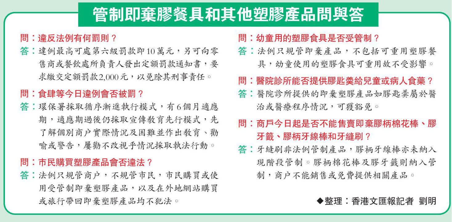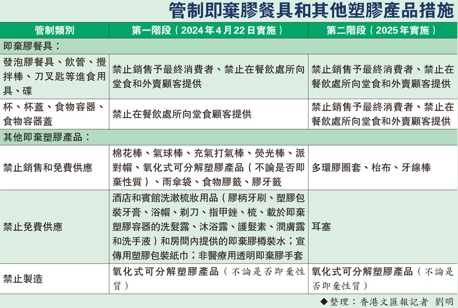 香港首階段管制即棄塑膠餐具和其他塑膠產品今起實施,餐飲處所禁止向顧客提供9類即棄膠餐具,酒店亦不可免費提供即棄瓶裝水、洗漱梳妝用品,商戶亦不可派發即棄雨傘袋,銷售即棄塑膠棉花棒、膠牙籤及牙線棒等物品。