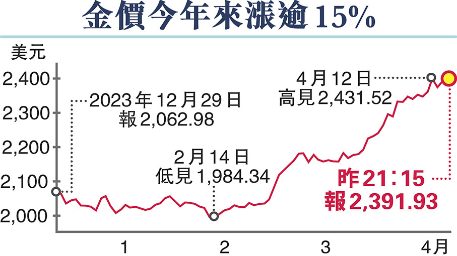 (香港文匯報記者 李昌鴻 深圳報道)受俄烏衝突、巴以衝突和美聯儲降息預期等因素影響,加上一些國家的央行不斷地增持黃金,國際金價近期像脫韁的野馬一路狂奔,4月12日倫敦金(現貨黃金)金價一度突破2,400美元的歷史高點。今年以來金價漲幅逾15%,超過去年全年水平。香港文匯報記者日前在深圳著名黃金珠寶交易中心羅湖水貝市場看到,周大福金飾價格已飆升至驚人的每克736元(人民幣,下同),有人更是以斤來買金條用於投資。有基金經理指出,短期黃金市場價格已由博弈情緒主導,與基本面指引有所偏離,潛在調整概率在加大,提醒投資者留意風險。