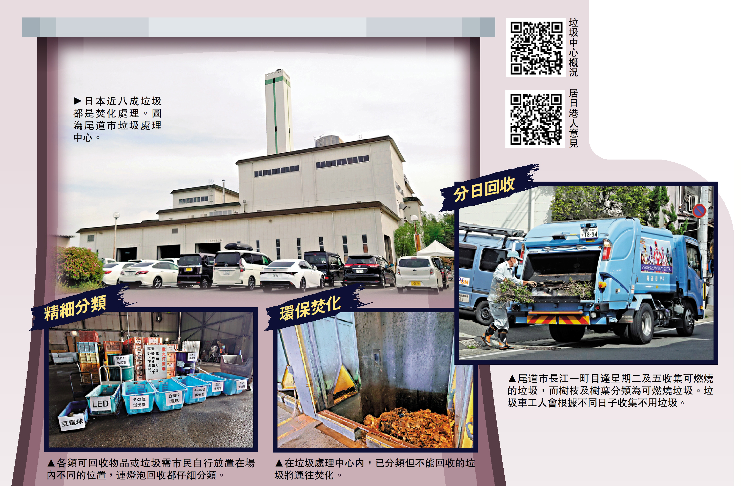日本各地的垃圾處理各有不同要求,充滿懷舊及文藝氣息的尾道市,每年吸引很多遊客到訪。港人阿強在尾道市經營民宿,他說,尾道的生活垃圾主要劃分為7類19種,但當地棄置生活垃圾毋須使用收費指定袋。民宿的垃圾要先分類,然後在指定日子放在路邊等候垃圾車回收;已清潔及分類的垃圾亦可暫存社區的小型清潔站,待累積一定量後,會由管理社區回收站的「街長」,送往尾道市垃圾處理中心回收,「如果要棄置的垃圾量太大,或要棄置大型垃圾,我們就要自己送到clean center(垃圾處理中心)回收。」
