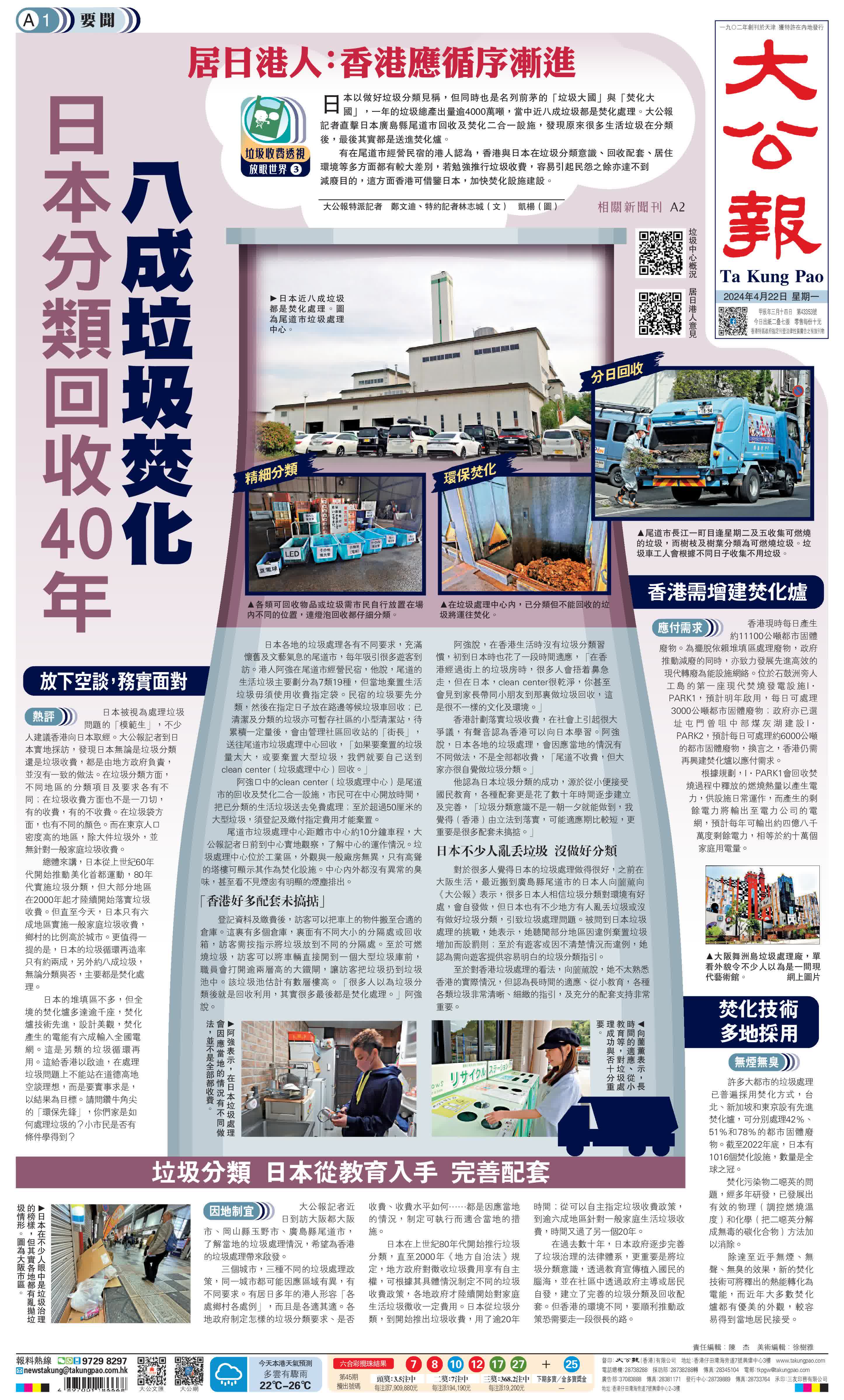 至於對香港垃圾處理的看法,向薗薫說,她不太熟悉香港的實際情況,但認為長時間的適應、從小教育,各種各類垃圾非常清晰、細緻的指引,及充分的配套支持非常重要。