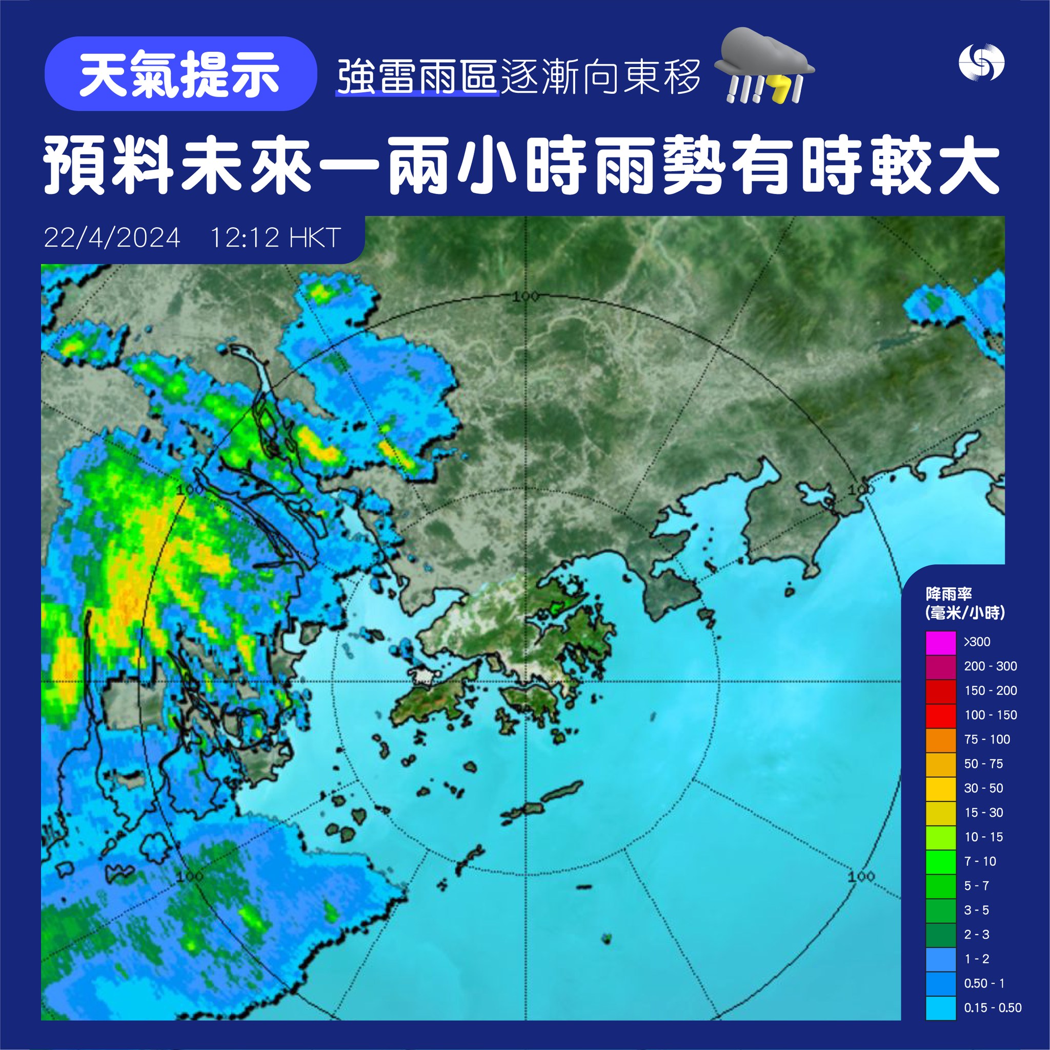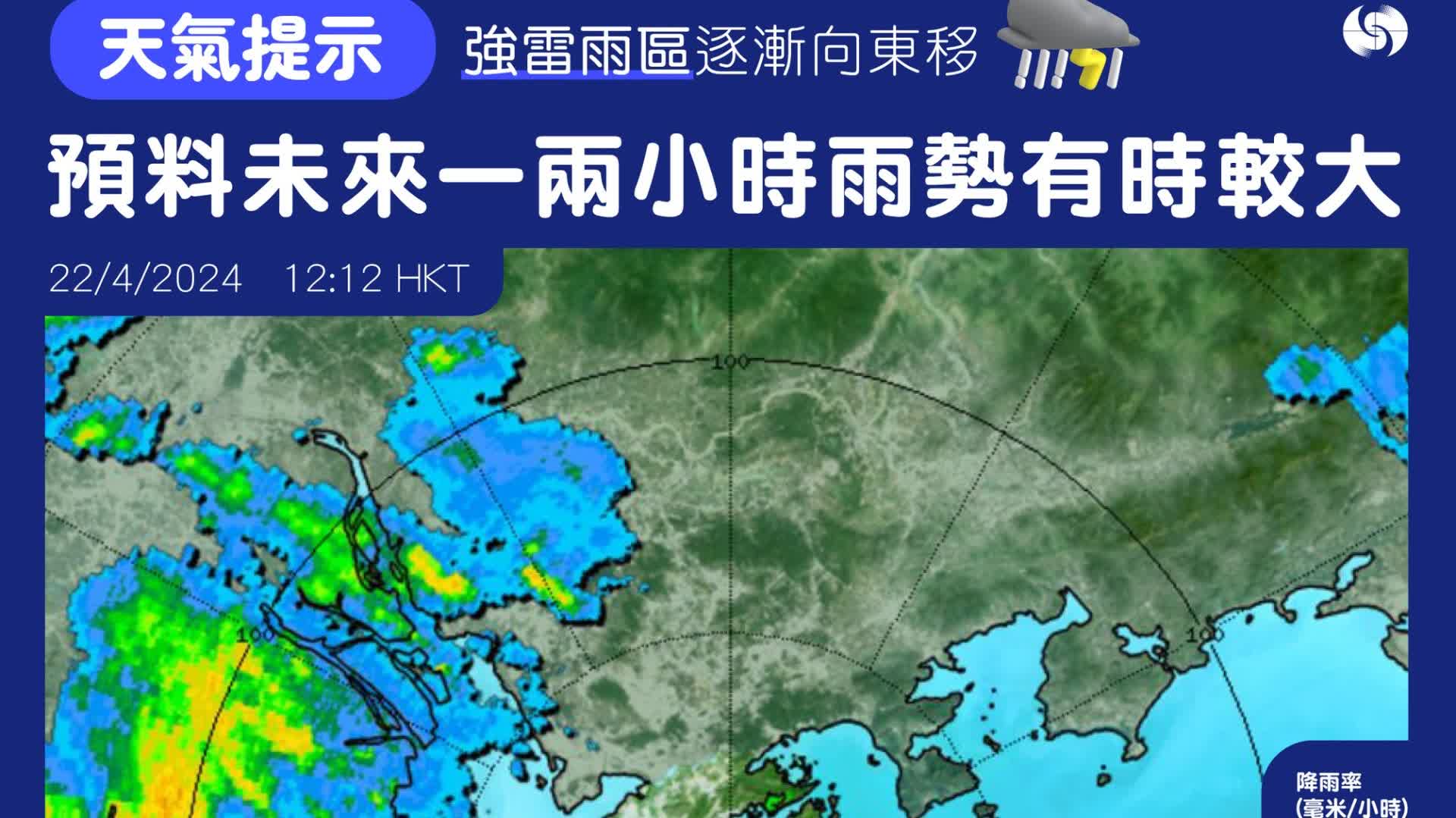 天文台指,位於珠江口以西的強雷雨區正逐漸向東移動,預料未來一兩小時本港雨勢有時較大及有狂風雷暴。市民應提高警惕。