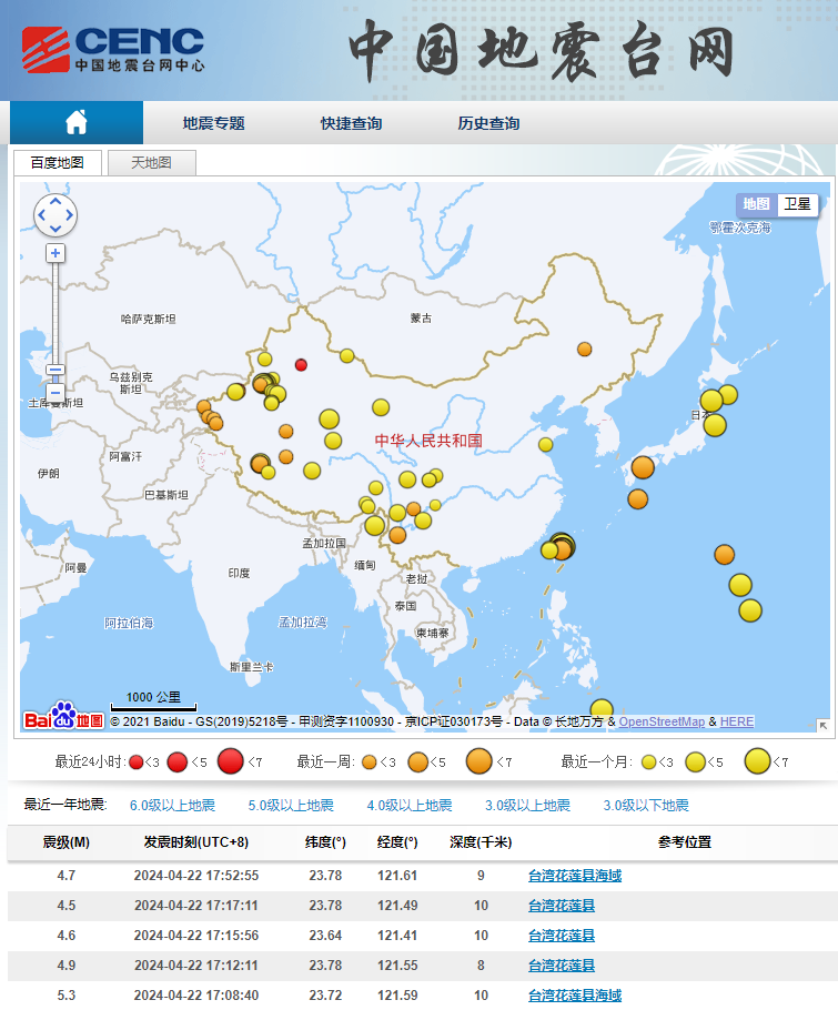 中國地震台網正式測定:04月22日17時52分在台灣花蓮縣海域(北緯23.78度,東經121.61度)發生4.7級地震,震源深度9千米。