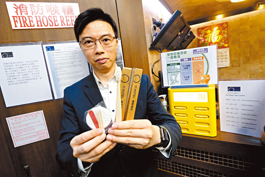 本身是旅遊促進會總幹事的奧斯酒店營運總監崔定邦表示,酒店由昨日開始,把提供給住客的用品全部轉用為非塑膠產品或可常用產品,例如轉用一次性紙包裝牙膏和木製的牙刷,洗頭水和沐浴露轉用可重複使用的樽裝產品,拖鞋亦轉用可重複使用材質產品,「我們根據法例要求行事,不會再向住客提供一次性塑膠產品,並會在前台售賣相關可替代品。」