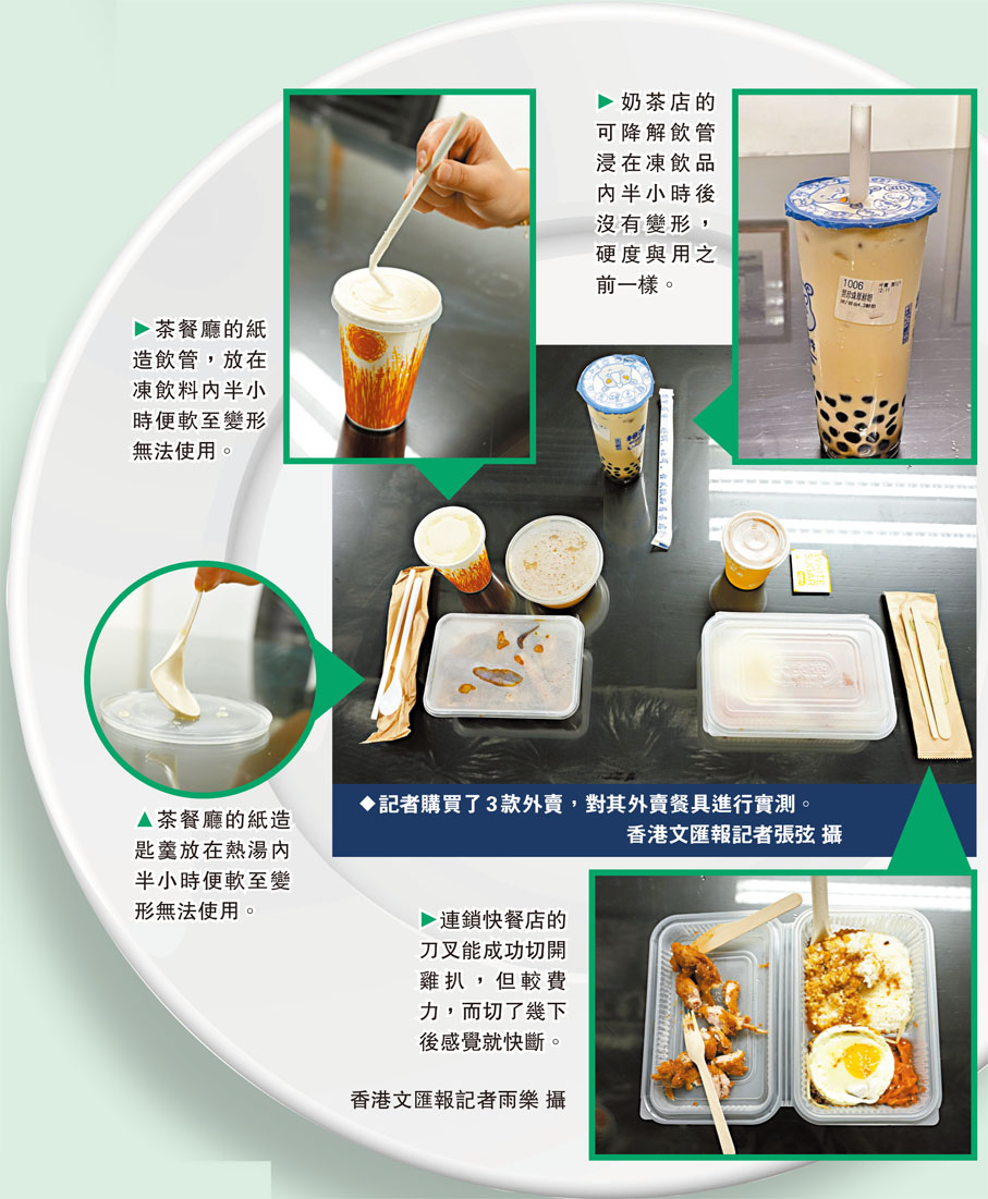 (香港文匯報記者 張弦、郭倩、費小燁)香港首階段管制即棄塑膠餐具及其他塑膠產品措施由昨日起實施,食肆、零售店和酒店賓館禁止向顧客提供膠刀叉匙、膠飲管、發泡膠餐具及膠柄牙刷等即棄膠餐具及塑膠產品,但設6個月適應期。香港文匯報記者昨日所見,部分處所仍在使用塑膠餐具。記者其後對兩間餐廳及一間奶茶店提供的餐具進行實測,發現奶茶店提供的可降解飲管表現最好,浸在凍飲品內半小時後亦沒有變形和變軟。有連鎖食肆提供的木製刀叉,則能成功切開炸雞塊而沒有變形,但較費力及易斷。不過,有茶餐廳提供的紙造飲管及匙羹,放在凍飲品及熱湯內半小時,均已軟至變形無法使用。看來業界及市民均仍需要時間適應新措施。