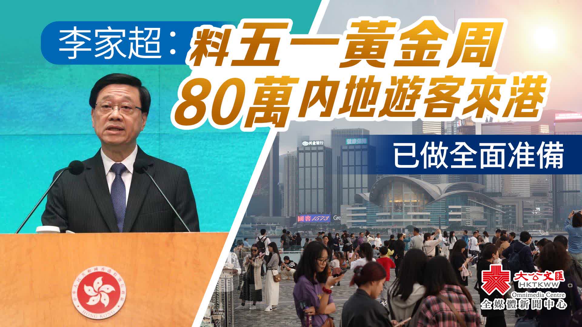 (大公文匯全媒體記者 李九歌)內地「五一」黃金周將至,行政長官李家超今日(23日)出席行政會議前見記者時表示,預計黃金周假期香港將迎80萬內地遊客來港消費旅遊,特區政府已為五一黃金周做全面準備,相信在入境管制站、機場、鐵路和陸路口岸將會有約590萬人次出入境,為確保對旅遊進行良好的管理並改善對遊客的服務,各出入境管制站的實際安排將再進行公布。此外,特別交通安排亦將實施。