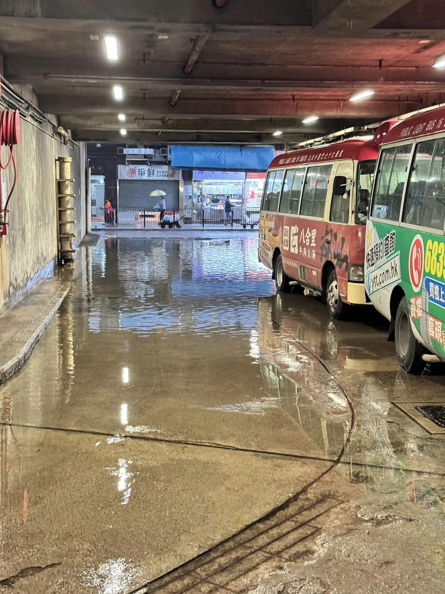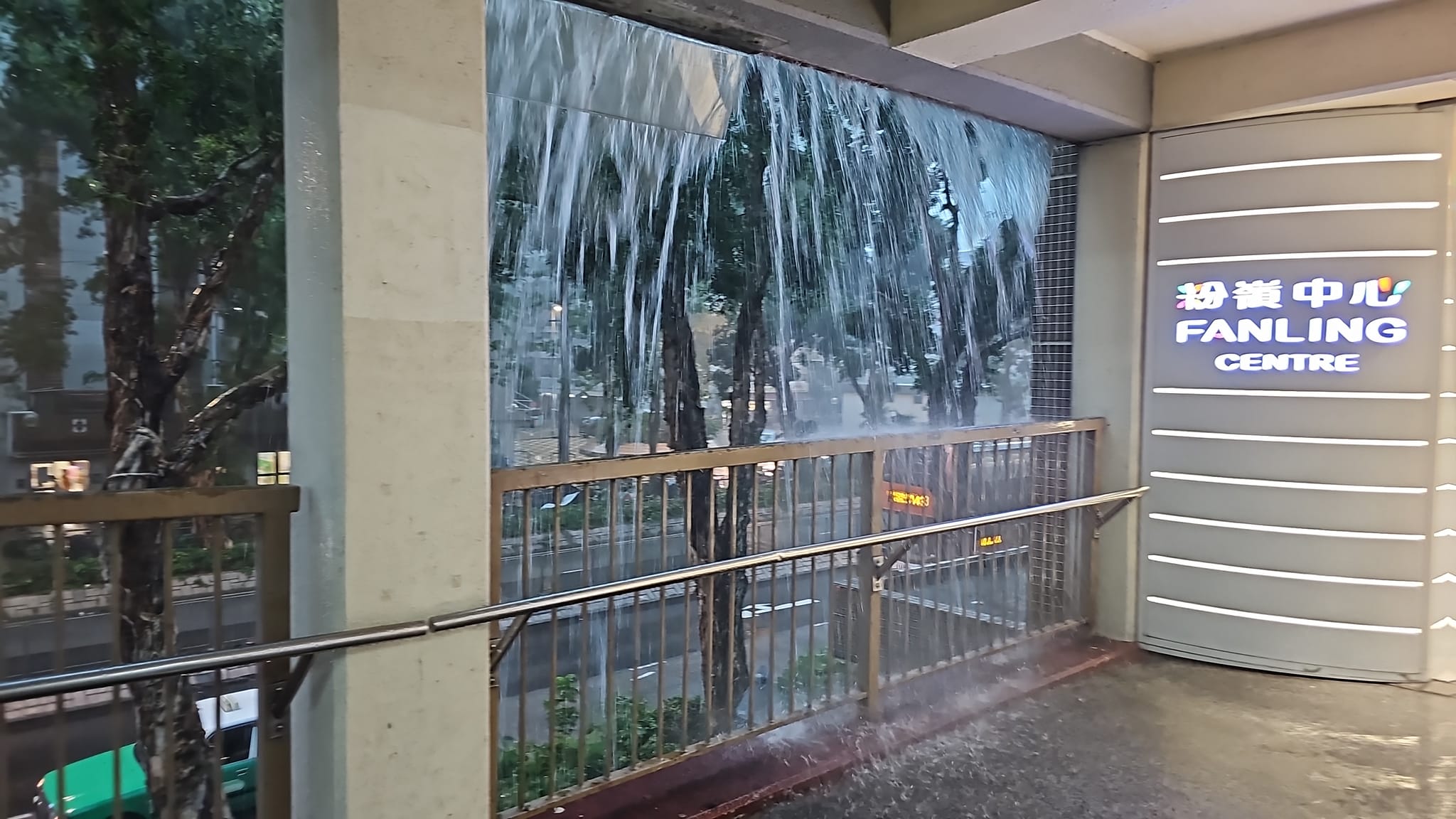 據網民於社交平台上載圖片,流浮山屏廈路有水浸,車輛要涉水而行。粉嶺中心如「水簾洞」,中心外則有積水。