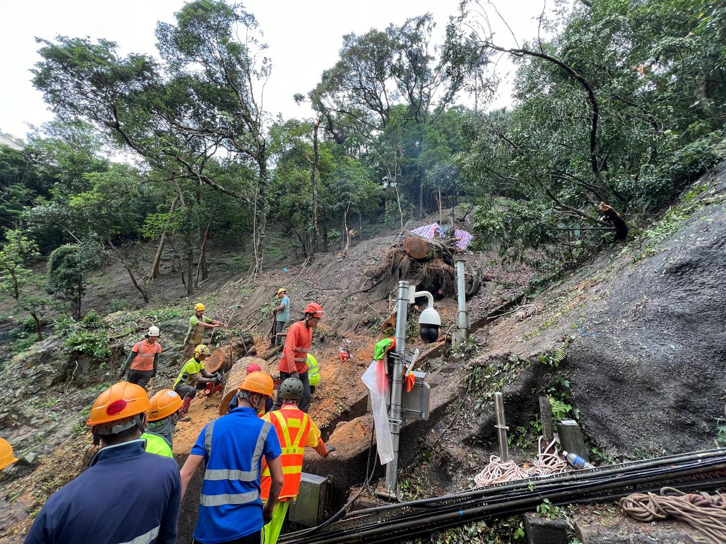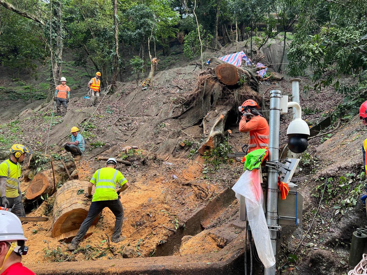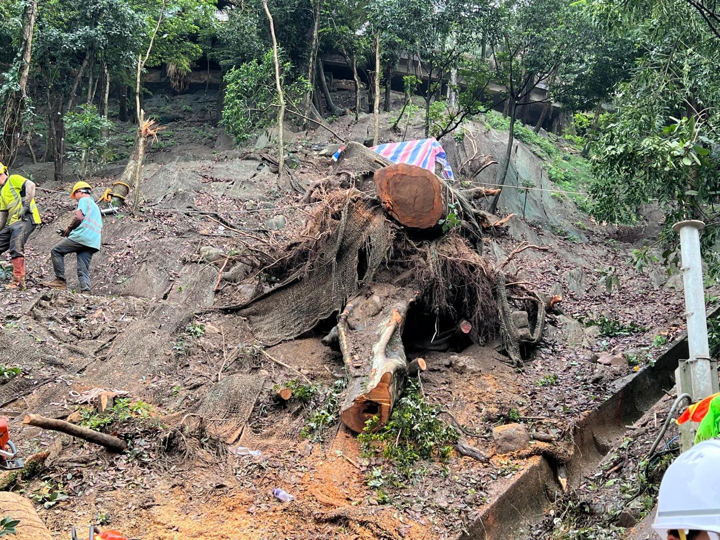 發展局指出,地政總署人員昨日已大致把倒塌於路軌上的樹幹移到路軌兩旁的山坡,今天主力把樹樁及樹幹從山坡移走,以免對纜車的運作構成風險。由於樹樁及樹幹數量和體積均龐大,而現場環境狹窄及地勢陡峭,加上連日大雨,令到清理工作十分困難。在發展局轄下樹木管理辦事處協調下,地政總署已聯同土木工程拓展署及路政署加派人手移除斜坡上餘下的樹樁及樹幹並進行搬運工作。