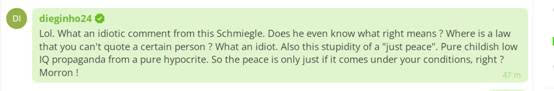「這個笨蛋發表了多麼愚蠢的言論。他知道什麼是權利嗎?哪有法律規定不能引用某人的言論?真是個蠢貨。還有這種愚蠢的『正義和平』之詞。一個純粹的偽君子做的純粹幼稚的低智商宣傳。所以只有在你的條件下才會實現和平,對吧?蠢蛋!」