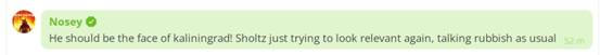 「他應該是加里寧格勒的代言人!朔爾茨只是想讓自己顯得更有價值,一如既往地胡說八道」。