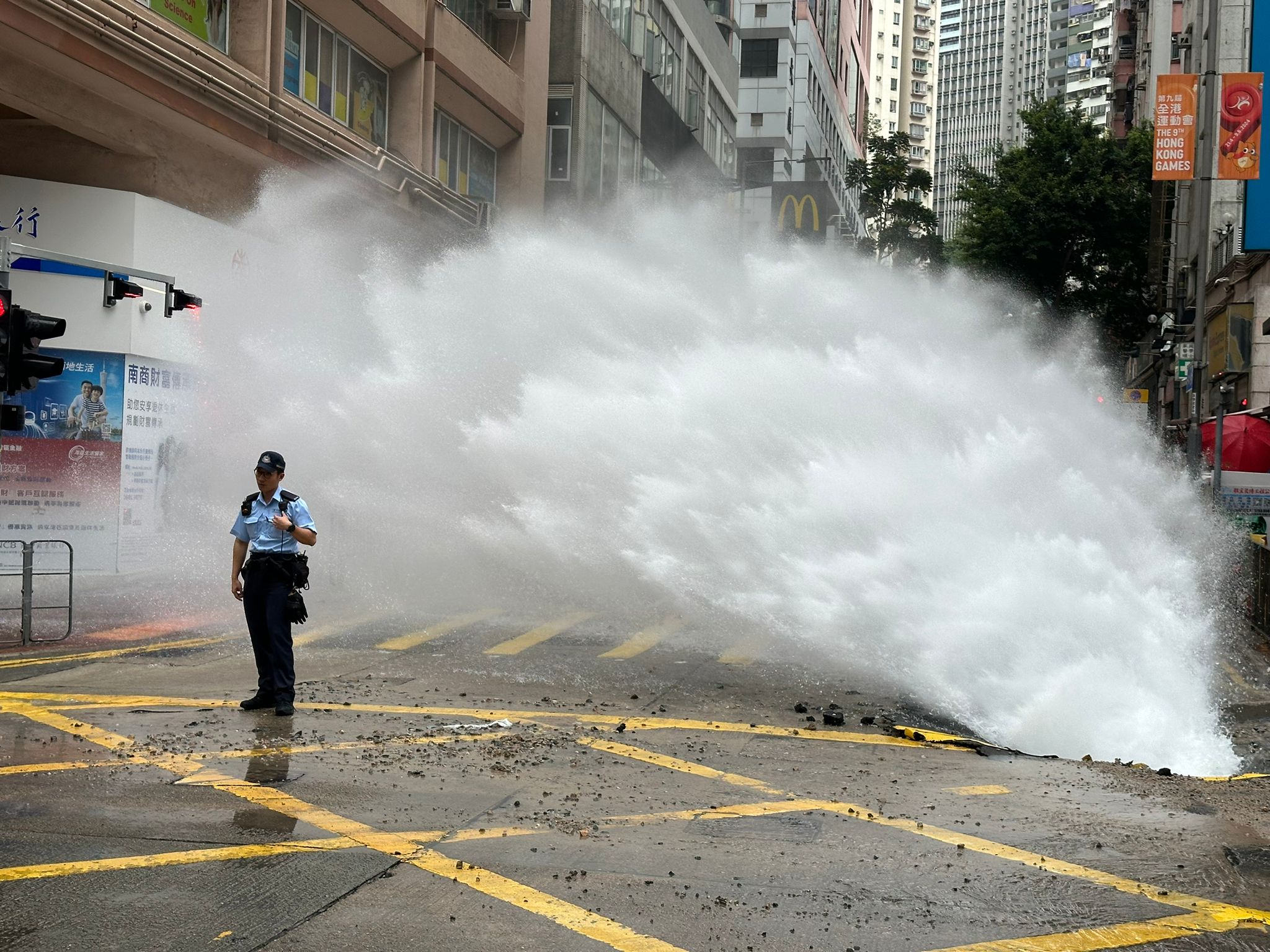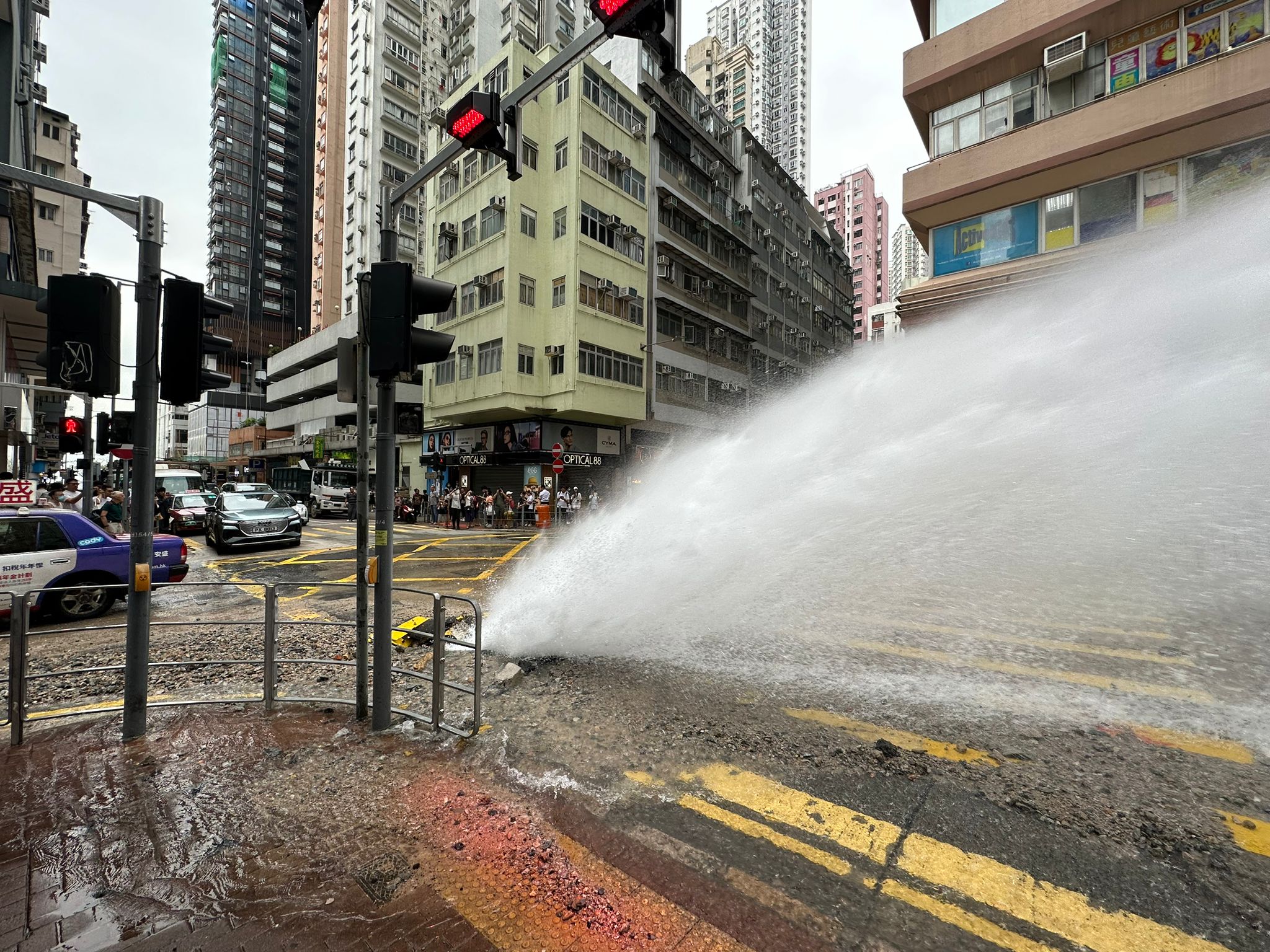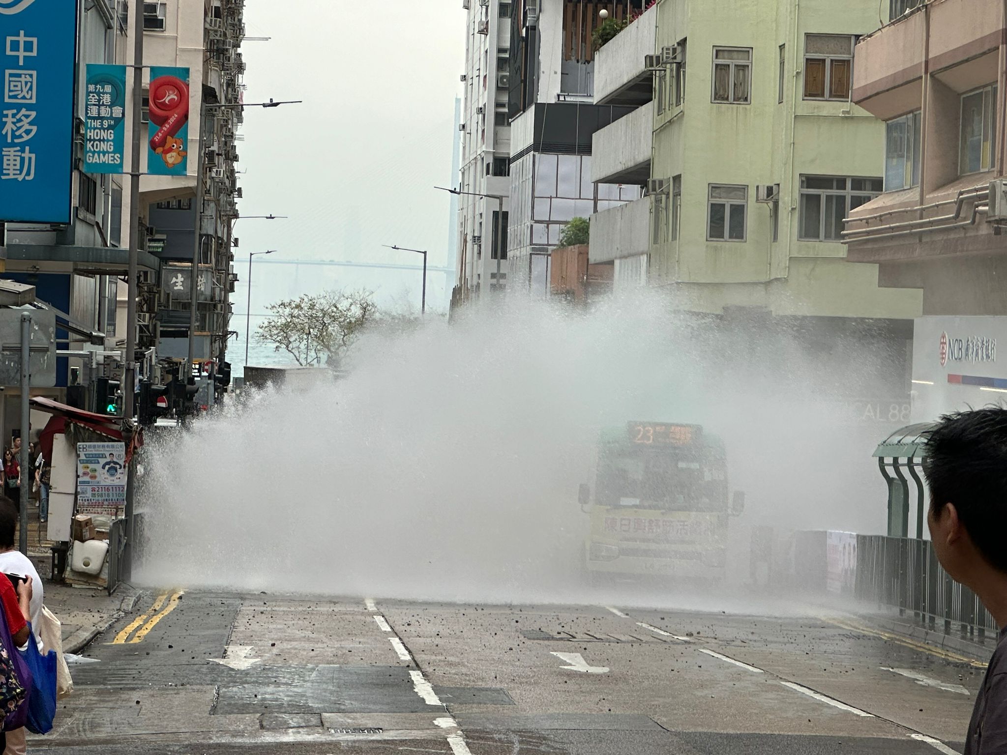 大公文匯全媒體報道,西環堅尼地城士美菲路附近今日(24日)下午爆地下水管,從讀者供圖可見,噴出約三至四米高水柱,猶如噴泉。警方接獲多名市民報案後趕往現場,其間通知水務署派員善後。