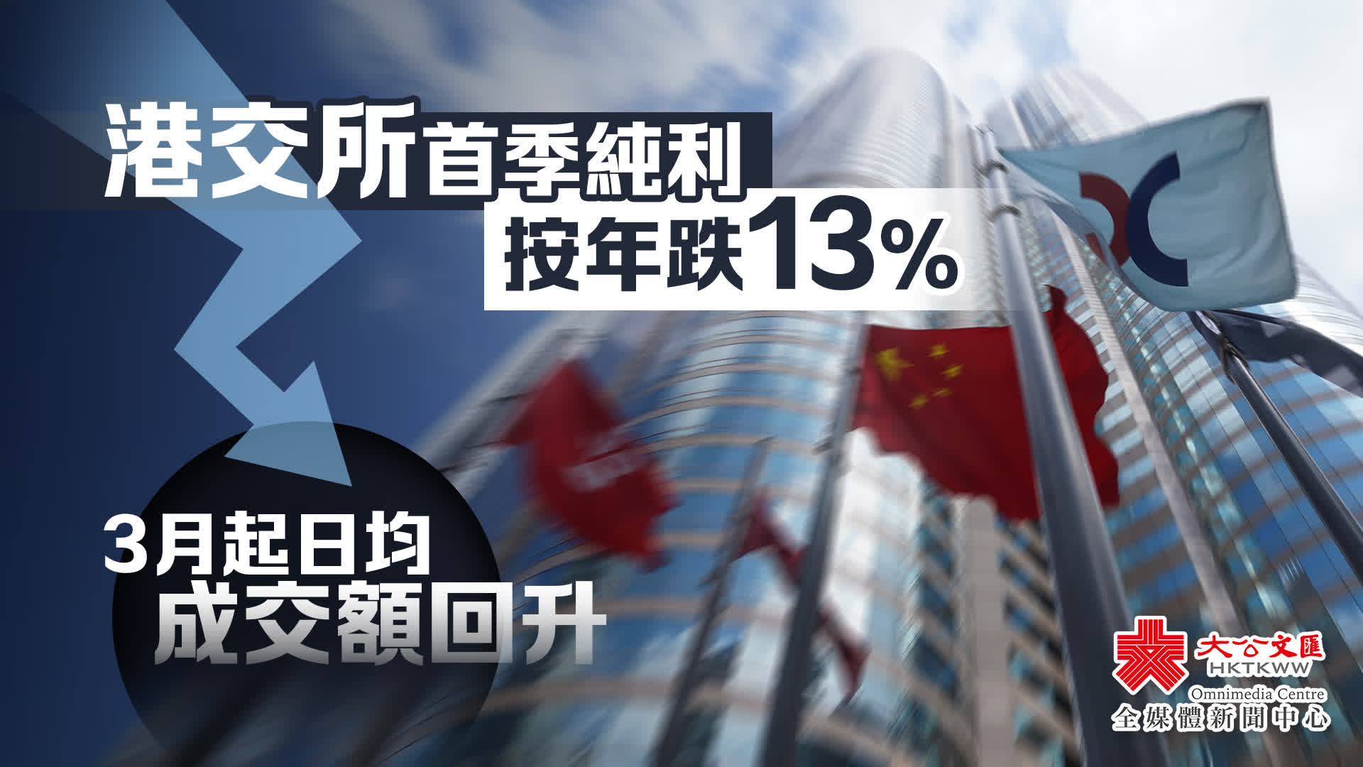 大公文匯全媒體報道,港交所今日(24日)公布首季業績,純利為29.7億元,按年跌13%。每股基本盈利2.35元。此外,今年首季現貨市場標題平均每日成交金額994億元,按年跌22%,按季升9%。集團指,3月和4月的日均成交額已經明顯回升,3月起的日均成交額回升至千億元水平。