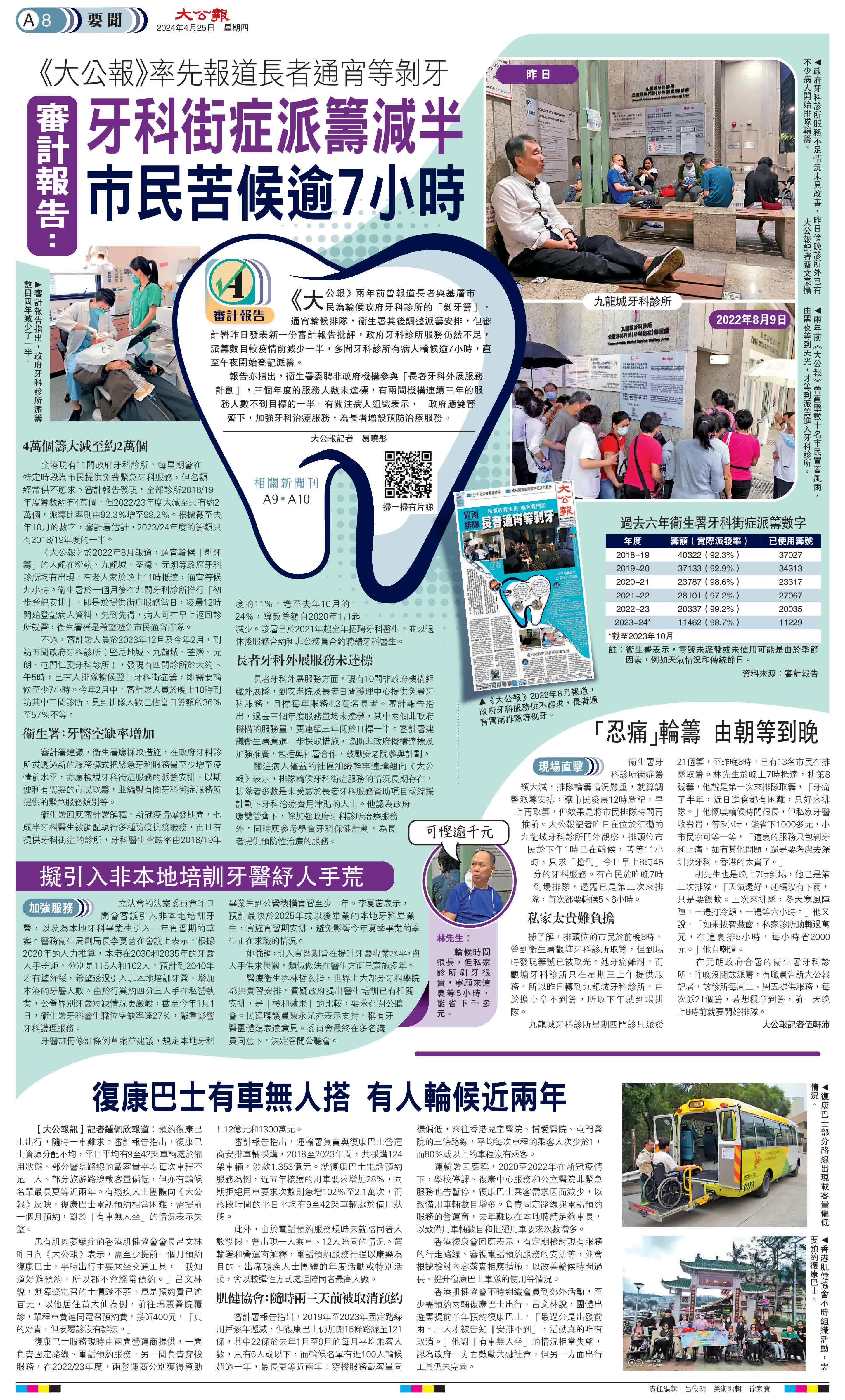 (大公報記者 易曉彤)《大公報》兩年前曾報道長者與基層市民為輪候政府牙科診所的「剝牙籌」,通宵輪候排隊,衞生署其後調整派籌安排,但審計署昨日發表新一份審計報告批評,政府牙科診所服務仍然不足,派籌數目較疫情前減少一半,多間牙科診所有病人輪候逾7小時,直至午夜開始登記派籌。