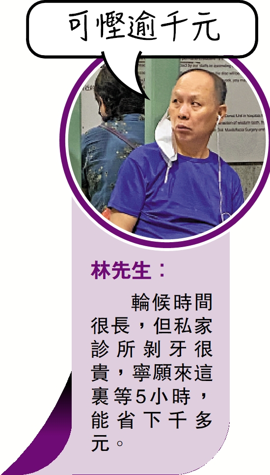 九龍城牙科診所星期四門診只派發21個籌,至昨晚8時,已有13名市民在排隊取籌。林先生於晚上7時抵達,排第8號籌,他說是第一次來排隊取籌,「牙痛了半年,近日進食都有困難,只好來排隊。」他慨嘆輪候時間很長,但私家牙醫收費貴,等5小時,能省下1000多元,小市民寧可等一等,「這裏的服務只包剝牙和止痛,如有其他問題,還是要考慮去深圳找牙科,香港的太貴了。」