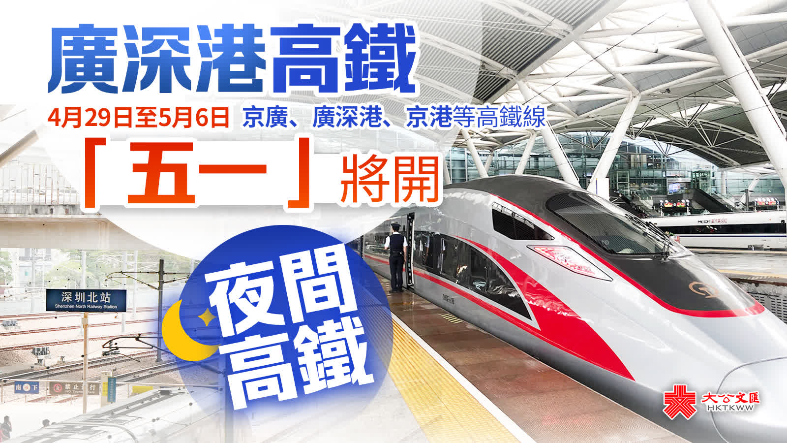 (大公文匯網記者 方俊明)「五一」假期臨近。廣鐵透露,今年「五一」小長假運輸期為4月29日至5月6日,動車組列車將全部上線,以配置最強運力保障「五一」假期旅客出行。期間,廣鐵集團將在京廣、廣深港、京港等高鐵線路開行「夜間高鐵」。「五一」運輸期間,深圳北站往香港西九龍、廣州南等方向有餘票;廣州南站4月30日、5月1日開往深圳北、香港西九龍等方向尚有餘票。