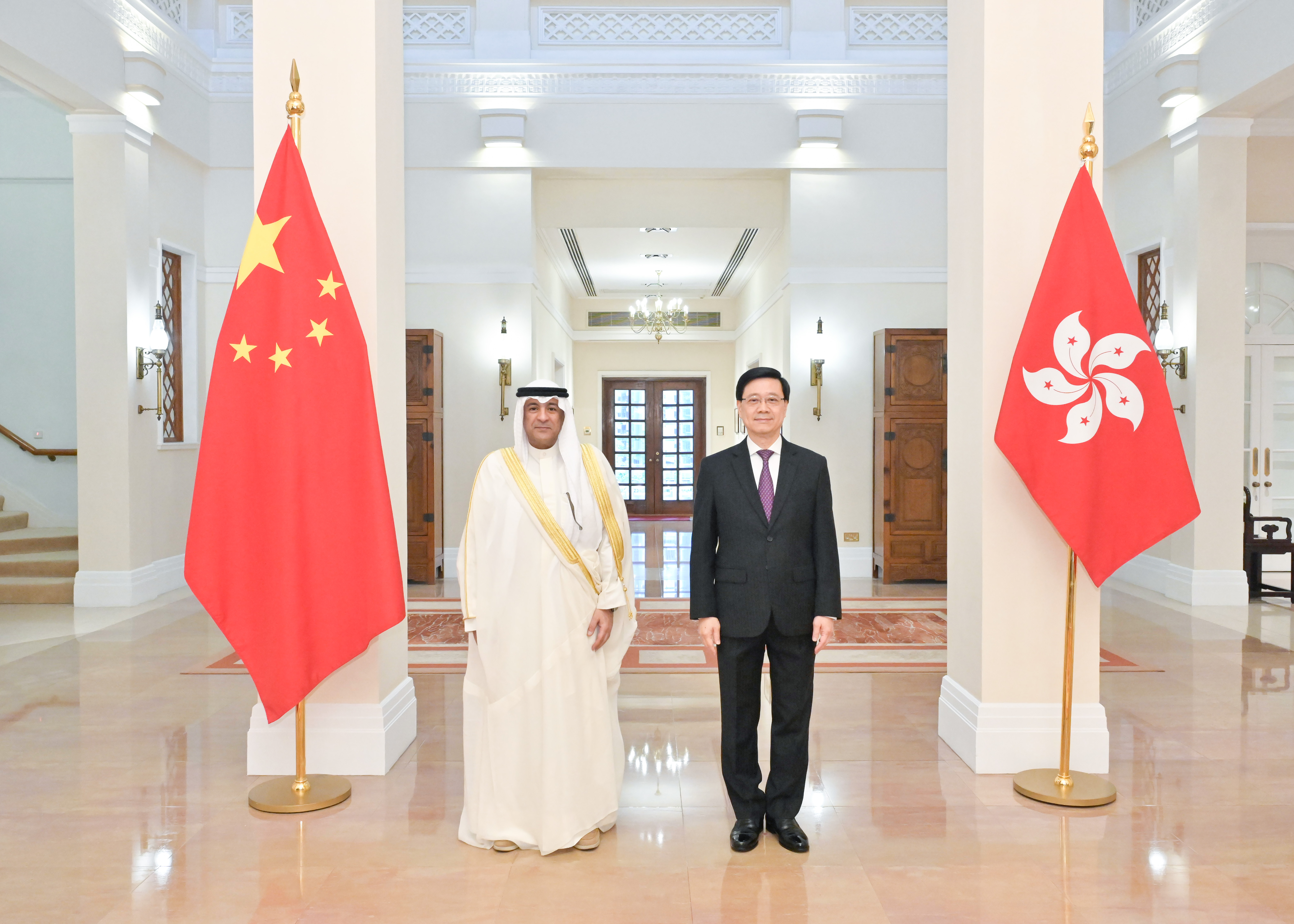 大公文匯全媒體報道,行政長官李家超今日(25日)在禮賓府與到訪香港的海灣阿拉伯國家合作委員會(海合會)秘書長賈西姆·布代維會面。商務及經濟發展局局長丘應樺和行政長官辦公室主任葉文娟亦有出席。