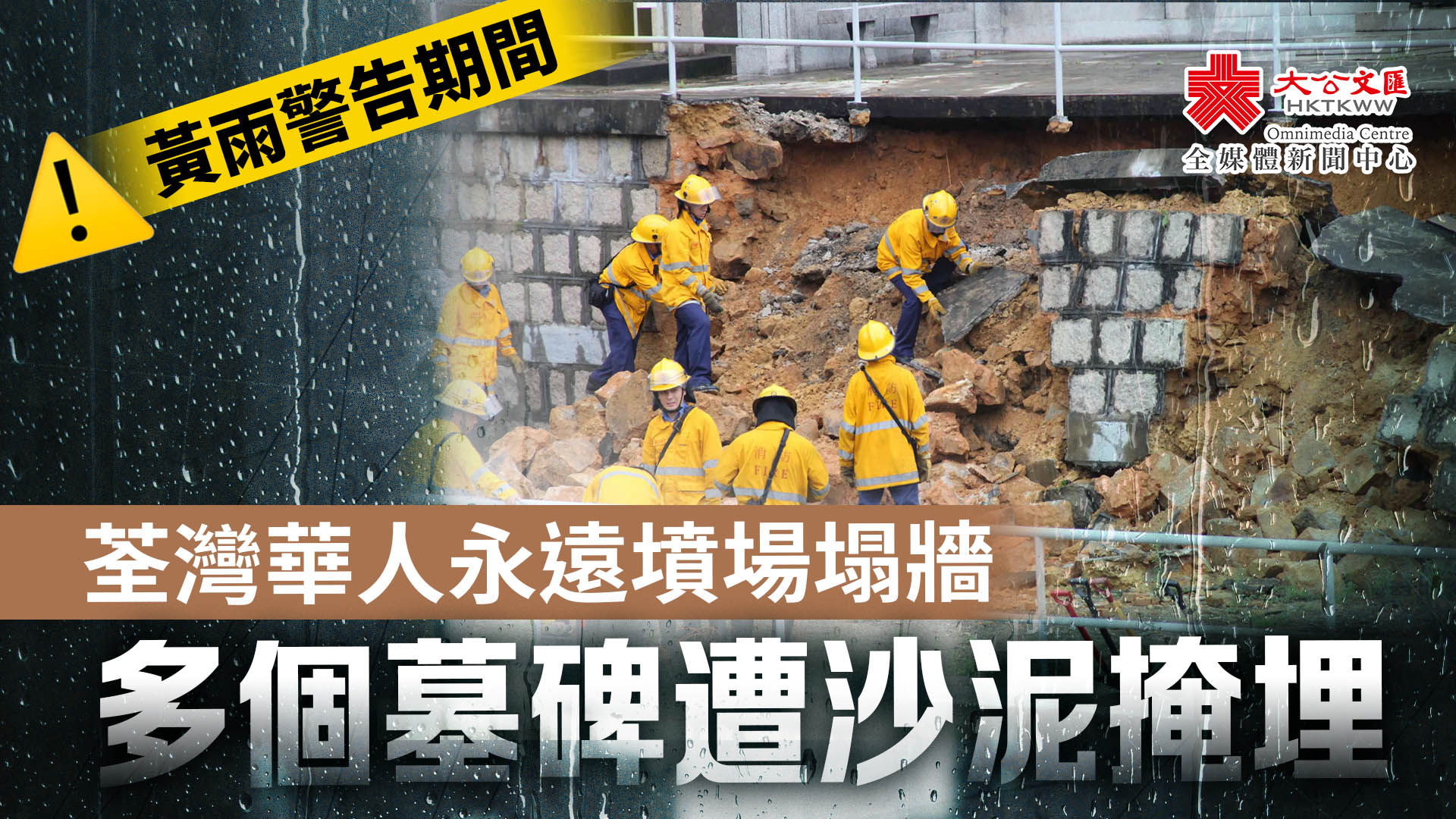大公文匯全媒體報道,本港今日(26日)上午黃色暴雨警告信號生效逾5小時,荃灣華人永遠墳場在警告生效期間,有護土牆倒塌,多個墓碑被塌下的沙泥掩埋,事件中無人受傷。