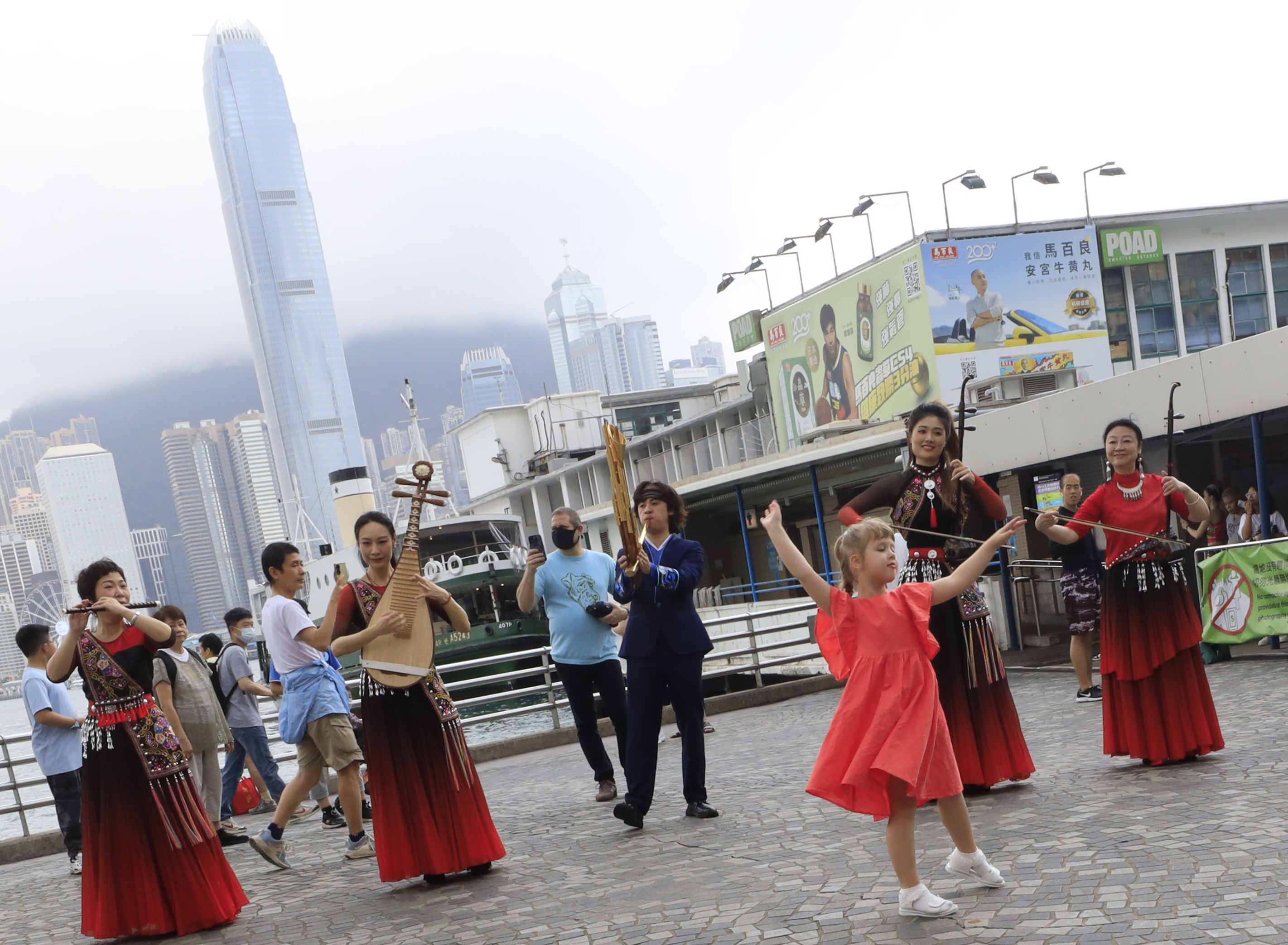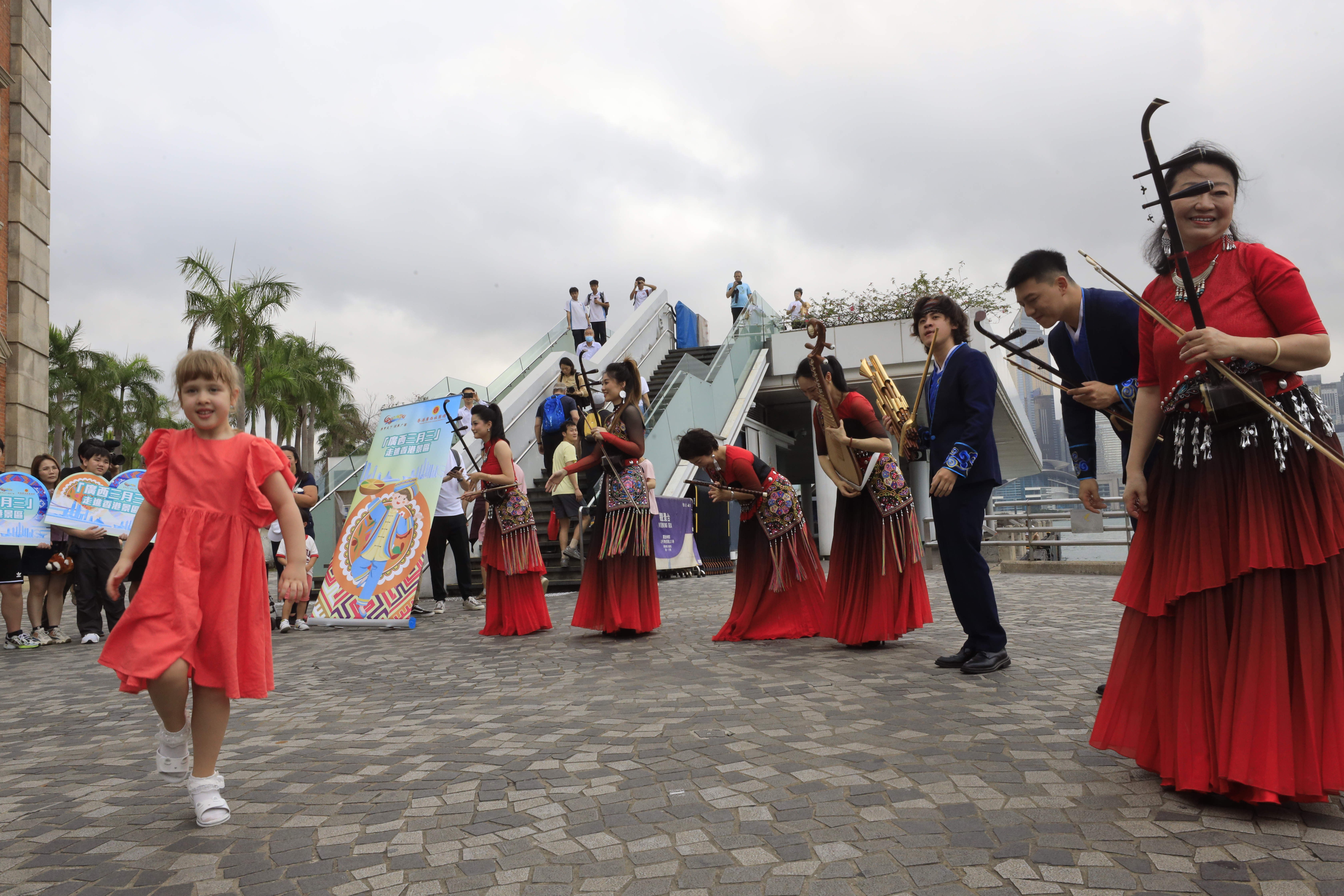 在尖沙咀公眾碼頭,由二胡、琵琶、蘆笙等民族樂器合奏的民樂《三姐的歌謠》吸引了一位來自俄羅斯的5歲小姑娘Vera,她情不自禁地走上前去,在民樂隊的演奏中翩翩起舞。Vera的紅裙呼應着演奏者的民族長裙,產生了一種奇妙的中西文化碰撞,成為一道亮麗的風景線引得在場觀眾紛紛駐足欣賞和拍攝。Vera的祖母介紹說,小姑娘從小學習芭蕾舞,還會多種體育舞蹈,這次與父母和祖母一行4人到香港旅遊。在香港和中國民族元素親密接觸的Vera表示,香港非常美麗,下次還想再來。