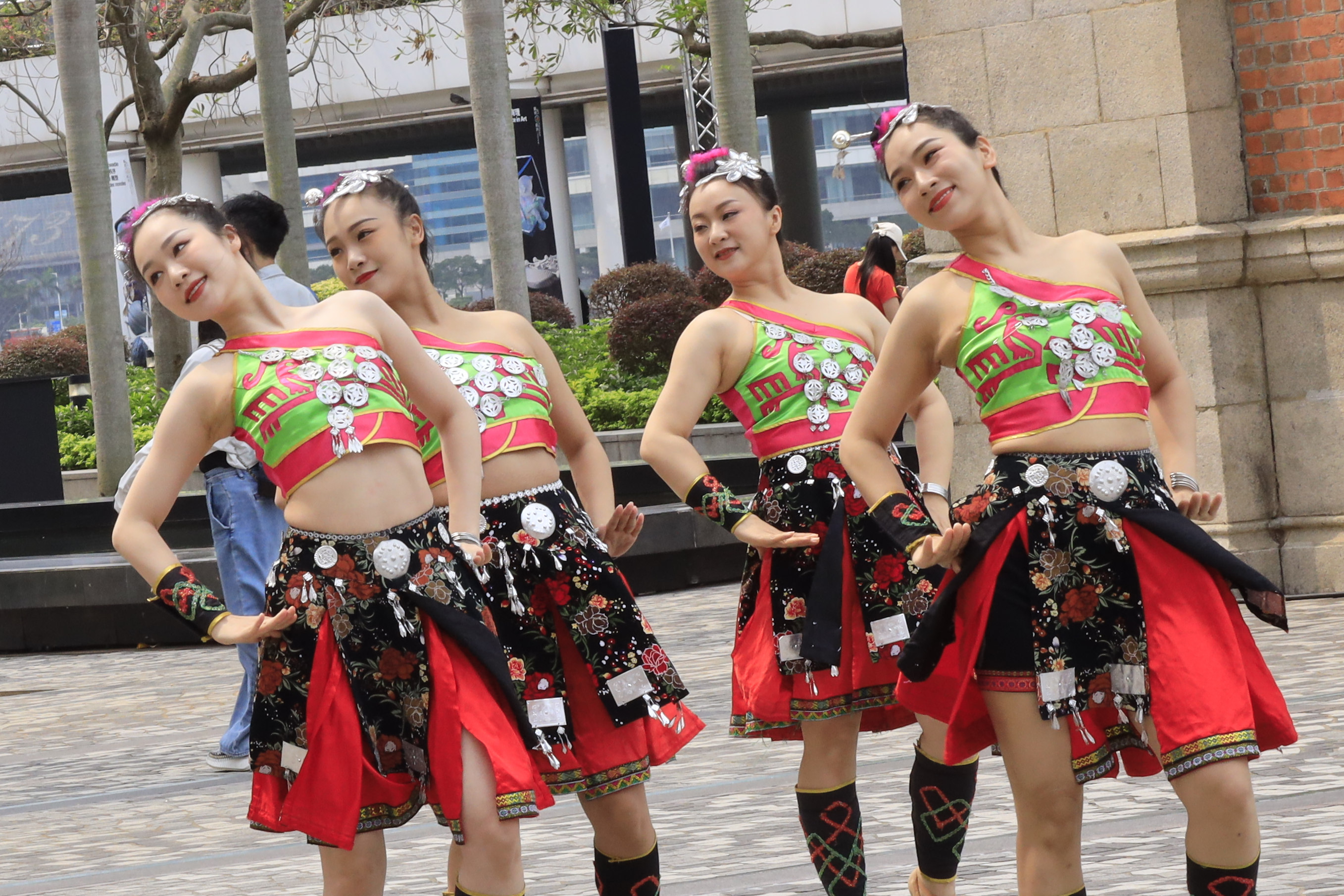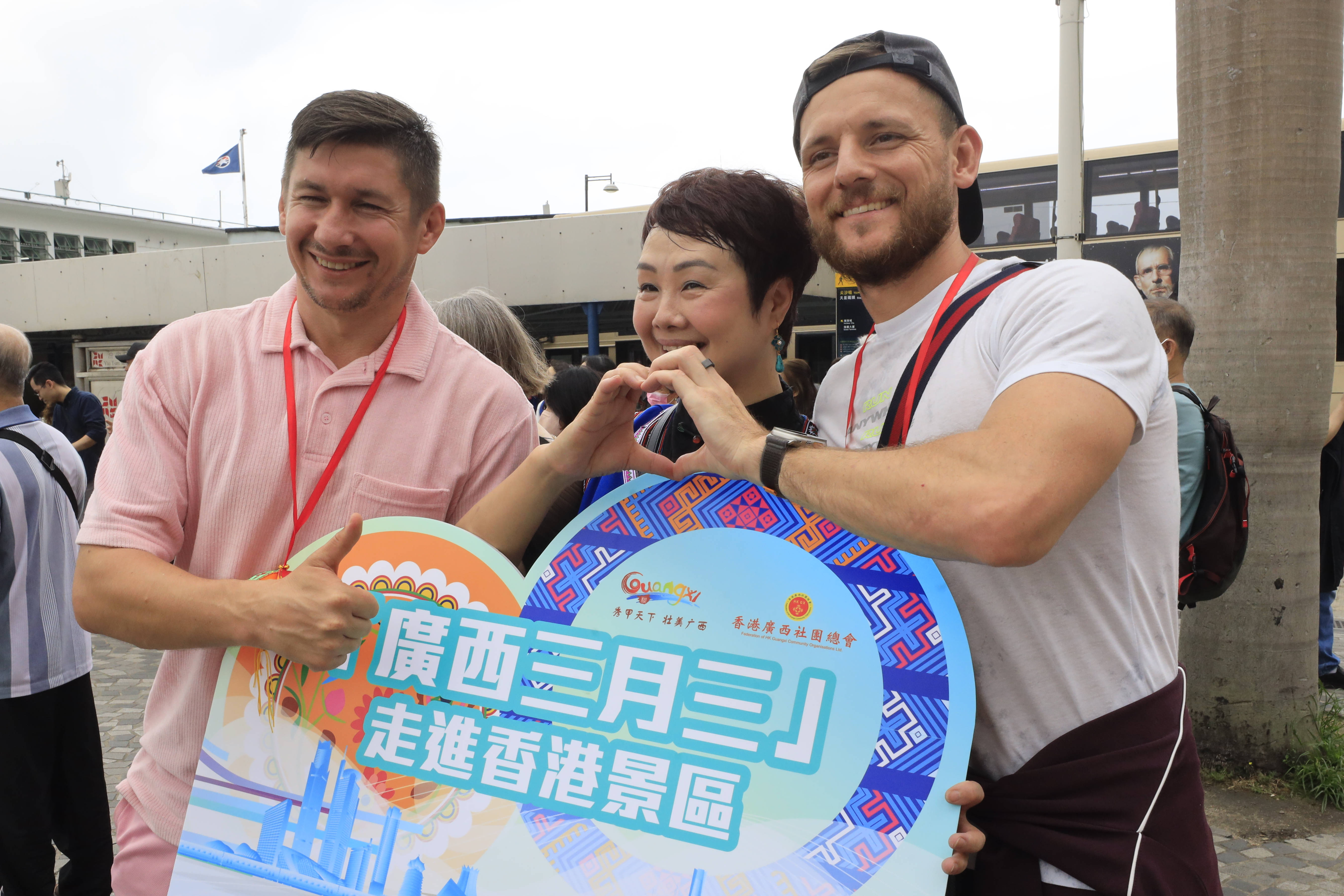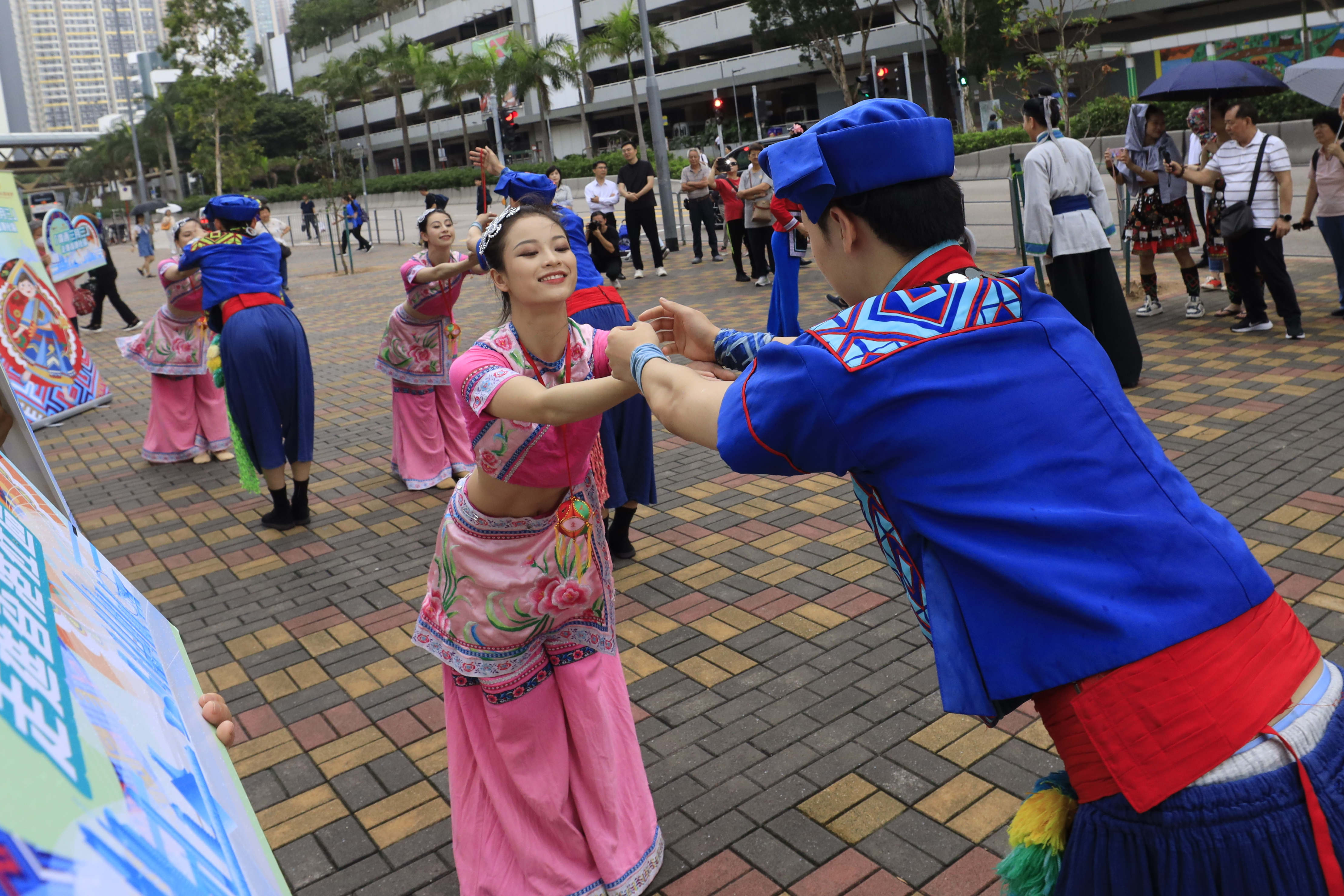 (香港文匯報記者 胡恬恬)由廣西壯族自治區黨委統戰部、廣西壯族自治區政府新聞辦公室、廣西壯族自治區文化和旅遊廳、廣西北部灣國際港務集團有限公司和香港廣西社團總會聯合主辦的「廣西三月三」走進港澳系列活動,今日(27日)舉行走進香港社區、景區活動,在尖沙咀公眾碼頭和九龍深旺道舉辦兩場廣西民俗歌舞「快閃」表演,來自廣西歌舞劇院的青年演員們身着壯族、侗族等少數民族特色服飾載歌載舞,與市民和旅客來了一場近距離互動。多位外國遊客今日接受香港大公文匯全媒體訪問時形容在香港遇上具有中國民族特色的表演,讓他們感受到了百分百的快樂,他們會把在中國香港收穫的感受和祝福帶回國,也希望再訪美麗香港。