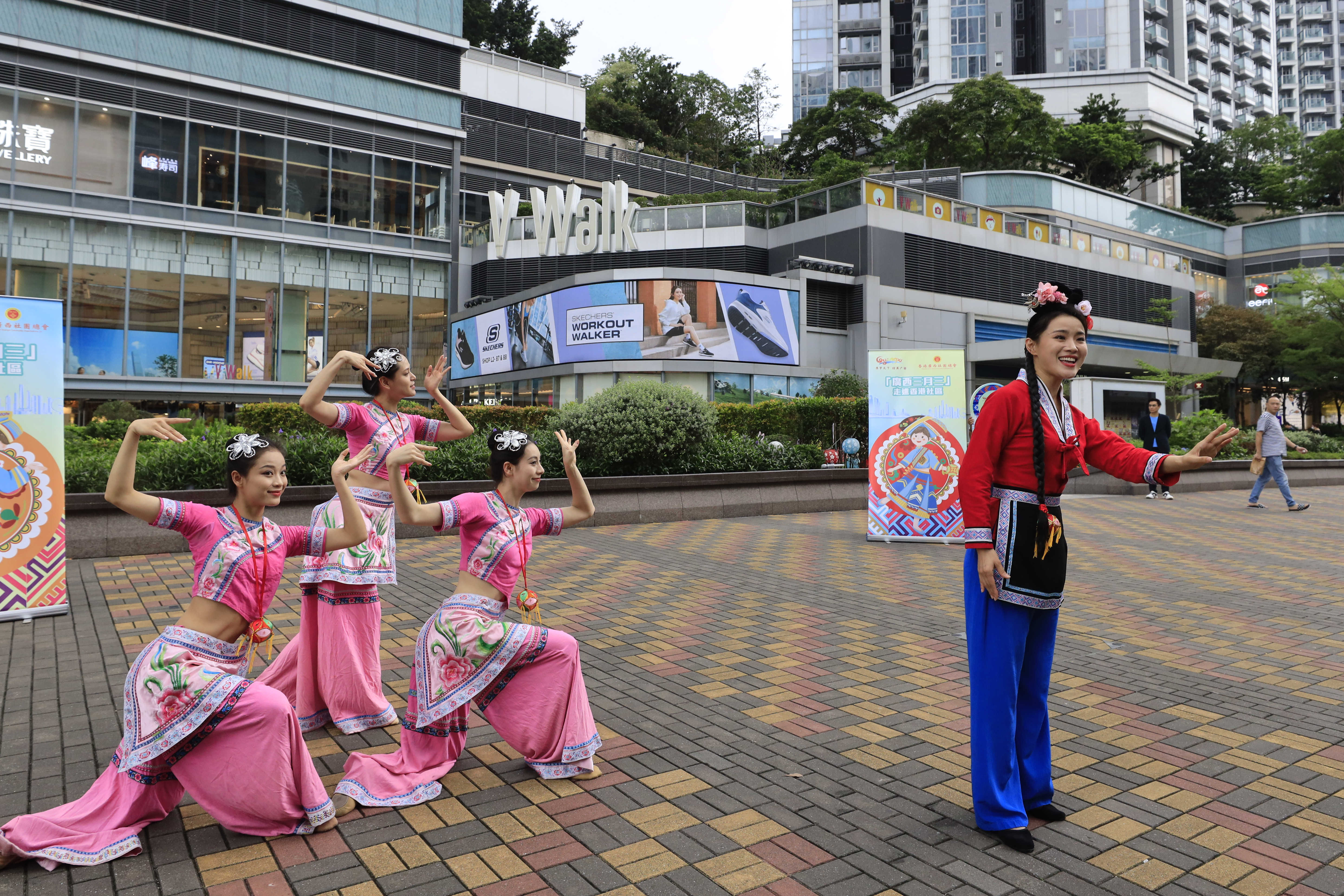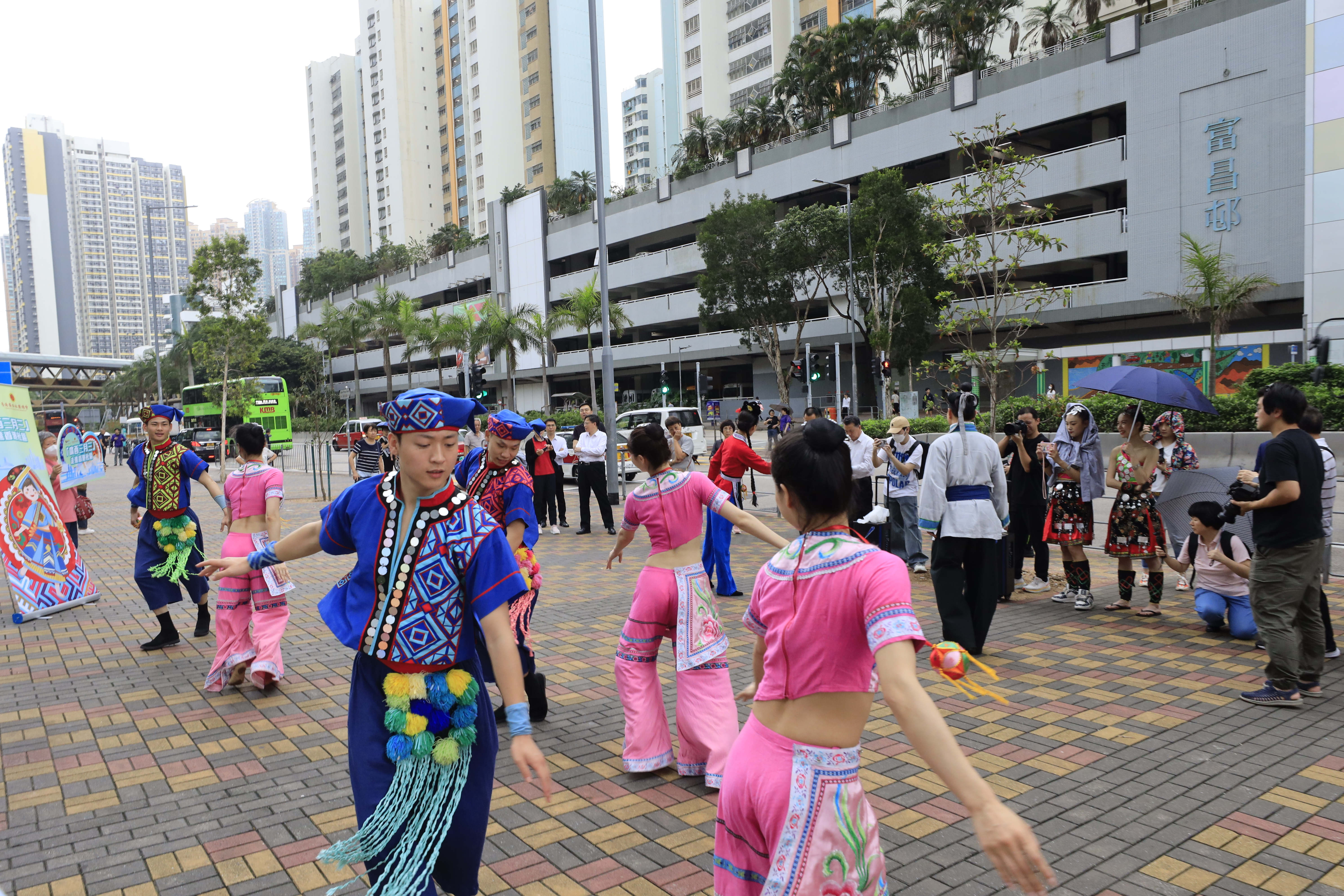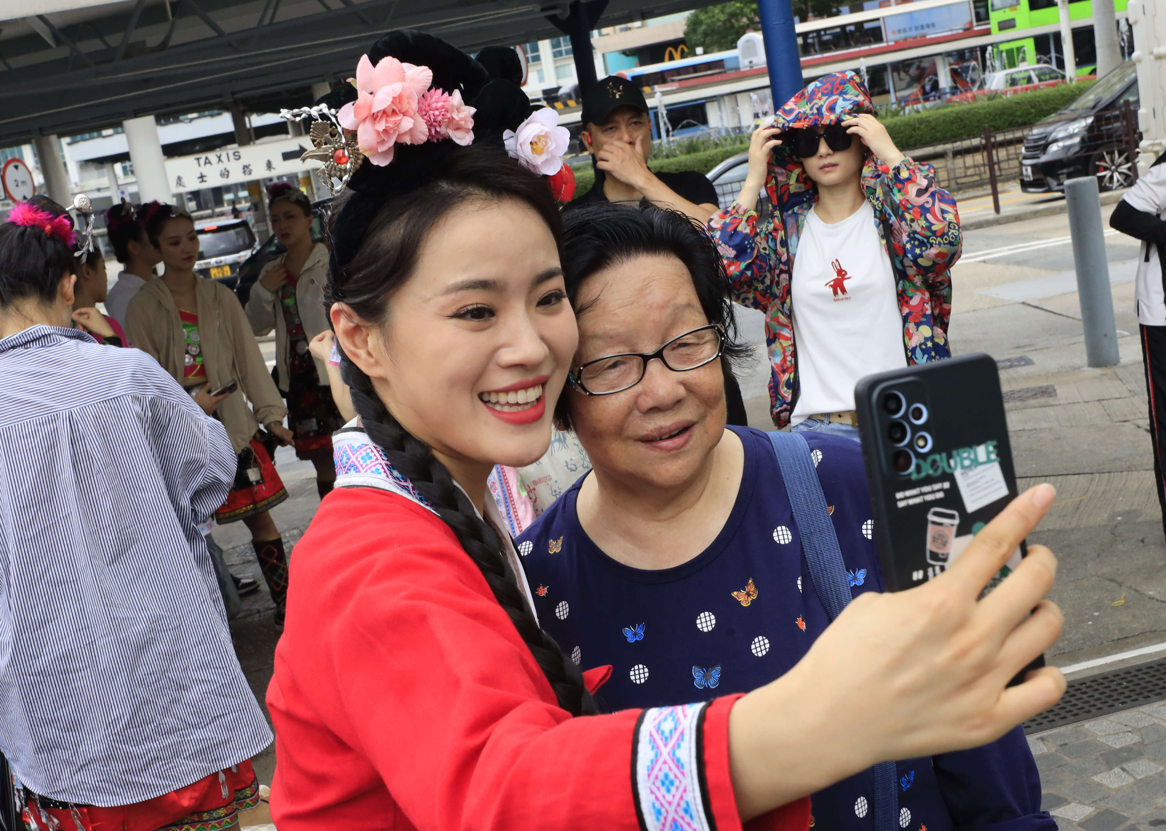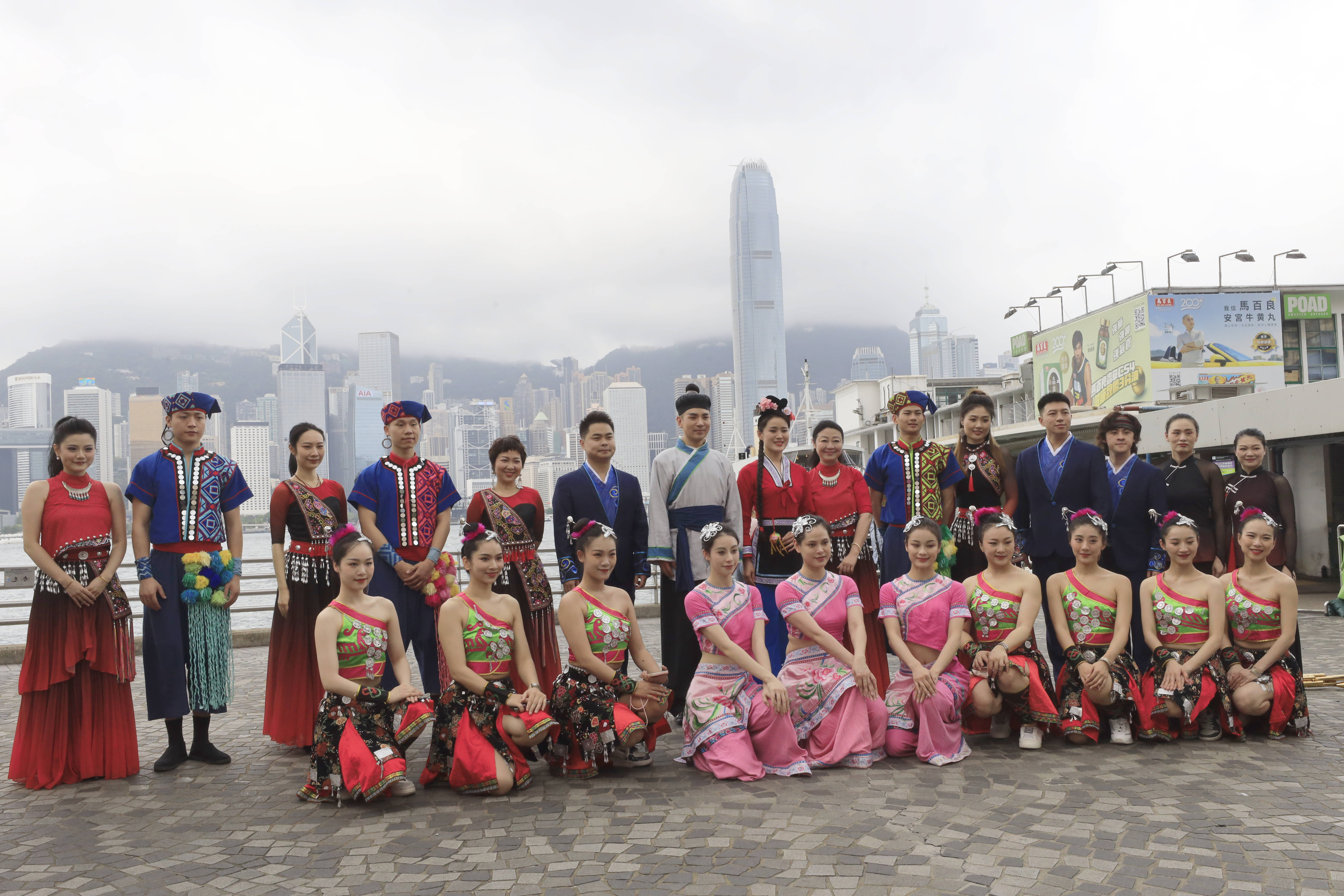 (香港文匯報記者 胡恬恬)由廣西壯族自治區黨委統戰部、廣西壯族自治區政府新聞辦公室、廣西壯族自治區文化和旅遊廳、廣西北部灣國際港務集團有限公司和香港廣西社團總會聯合主辦的「廣西三月三」走進港澳系列活動,今日(27日)舉行走進香港社區、景區活動,在尖沙咀公眾碼頭和九龍深旺道舉辦兩場廣西民俗歌舞「快閃」表演,來自廣西歌舞劇院的青年演員們身着壯族、侗族等少數民族特色服飾載歌載舞,與市民和旅客來了一場近距離互動。多位外國遊客今日接受香港大公文匯全媒體訪問時形容在香港遇上具有中國民族特色的表演,讓他們感受到了百分百的快樂,他們會把在中國香港收穫的感受和祝福帶回國,也希望再訪美麗香港。
