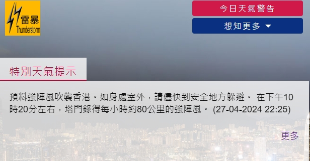 天文台指,在晚上10時20分左右,塔門錄得每小時約80公里的強陣風;另外在晚上10時許亦發出雷暴警告,預料香港有幾陣狂風雷暴。