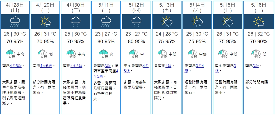 此外,天文台指明日稍後驟雨逐漸減少。氣溫介乎26至30度。吹和緩至清勁偏南風。下周一(29日)部分時間有陽光,亦有一兩陣驟雨。星期二及勞動節假期驟雨漸轉頻密及有雷暴。