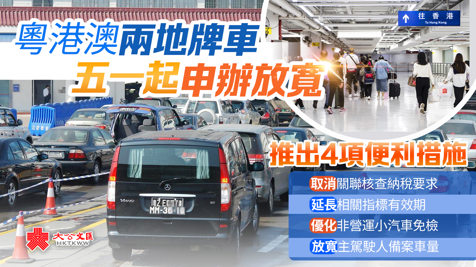 (大公文匯網記者 方俊明)5月1日起,粵港澳兩地牌車輛管理有優化!為更好滿足三地居民跨境通行需求,助力粵港澳大灣區融合發展,廣東省公安廳在認真總結前期兩地車管理情況基礎上,進一步優化車輛管理政策,將於今年5月1日推出取消關聯核查納稅要求、延長指標有效期、優化非營運小汽車免檢、放寬主駕駛人備案車輛數量4項便利措施。