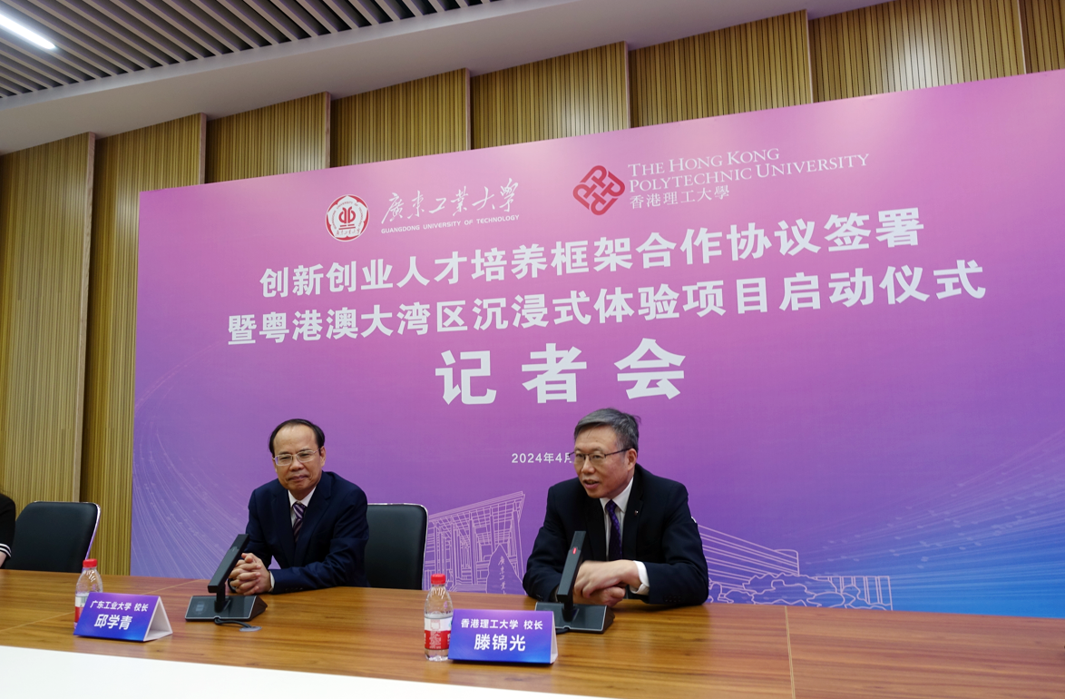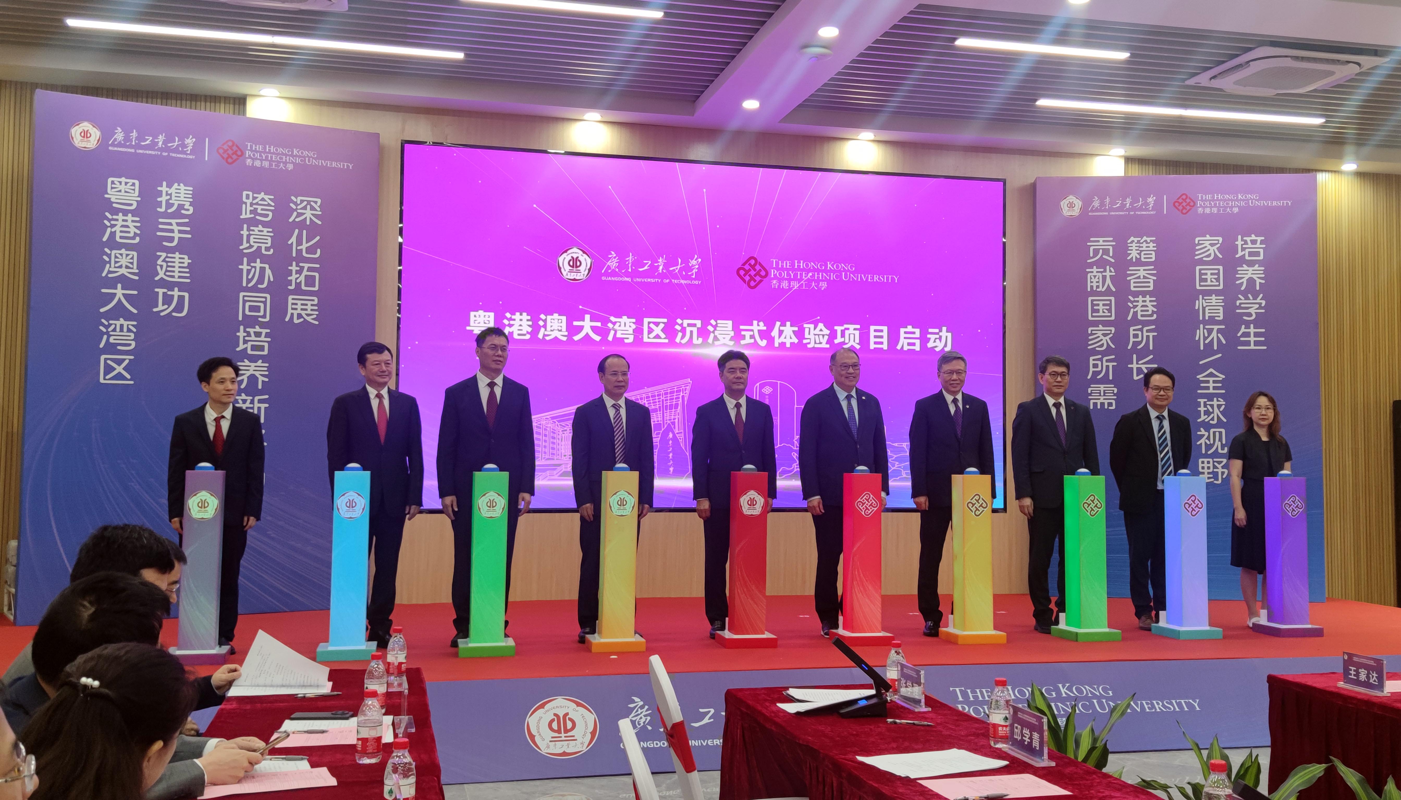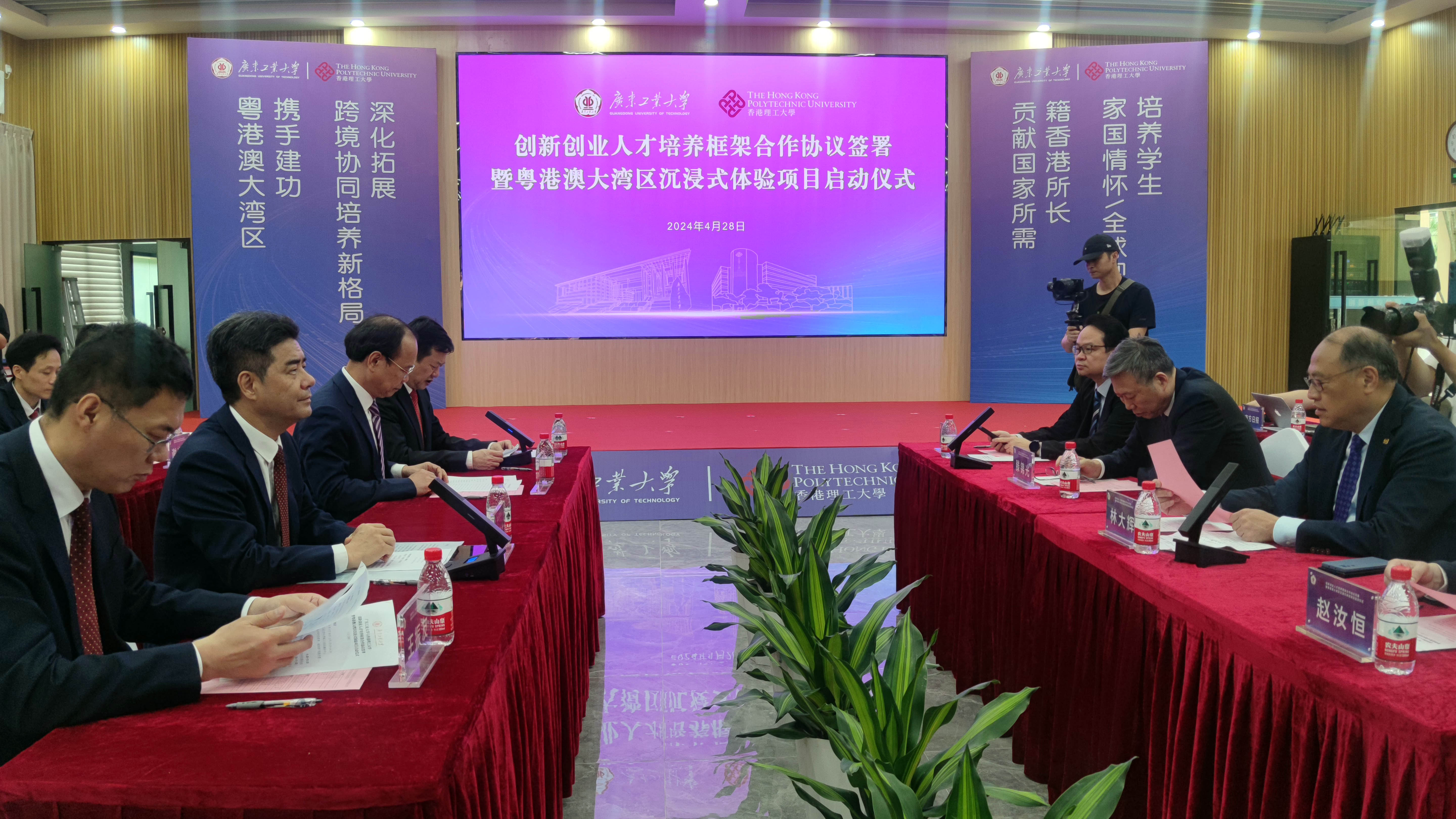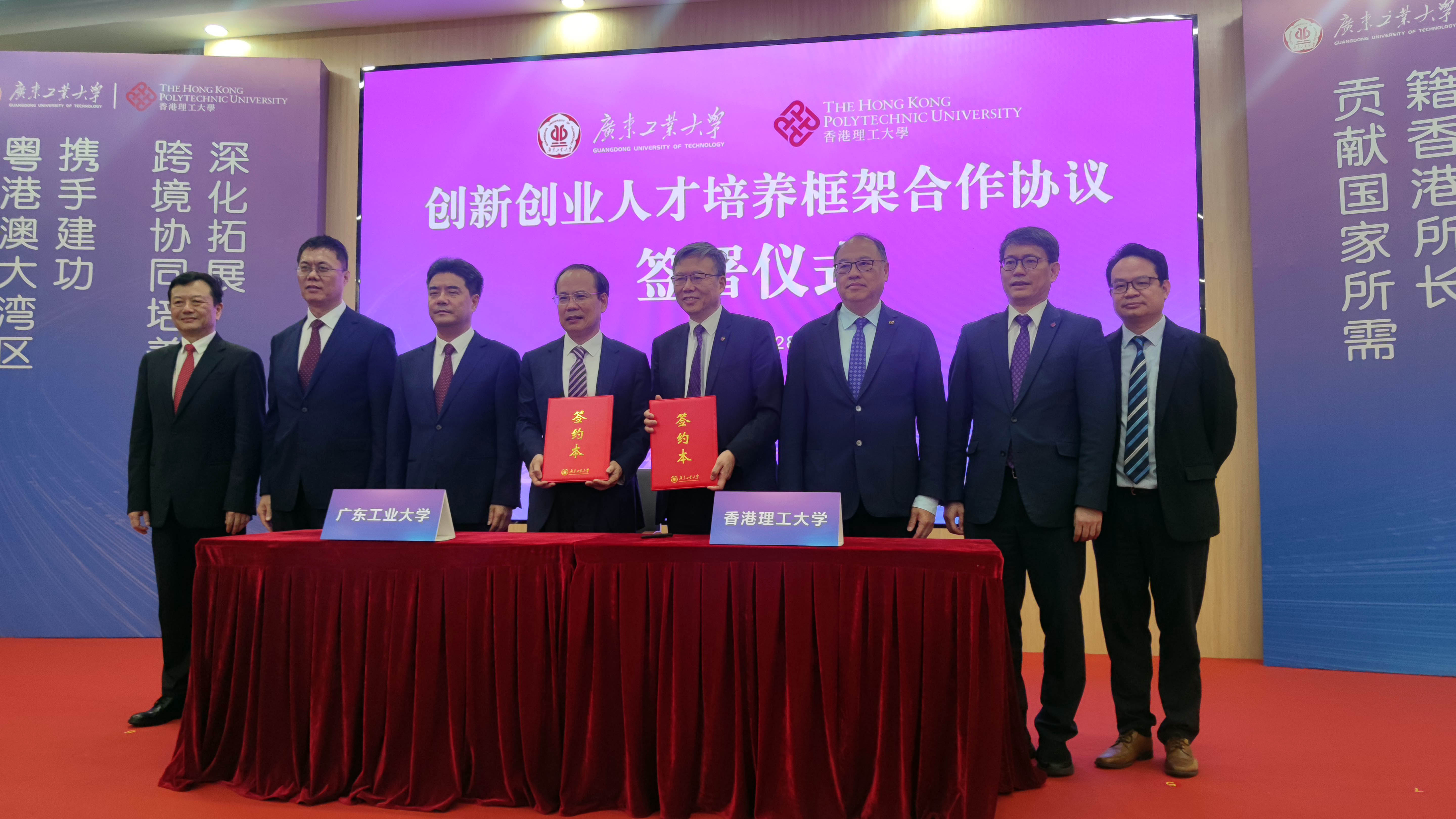 儀式上,兩所大學校長分別代表兩校簽訂《廣東工業大學與香港理工大學創新創業人才培養框架合作協議》。同時兩校合作的粵港澳大灣區沉浸式體驗項目亦正式啟動。該項目計劃開展為期七天的大灣區實地考察,組織兩校學生組隊學習和體驗,走進灣區頭部企業、洞察灣區市場趨勢。