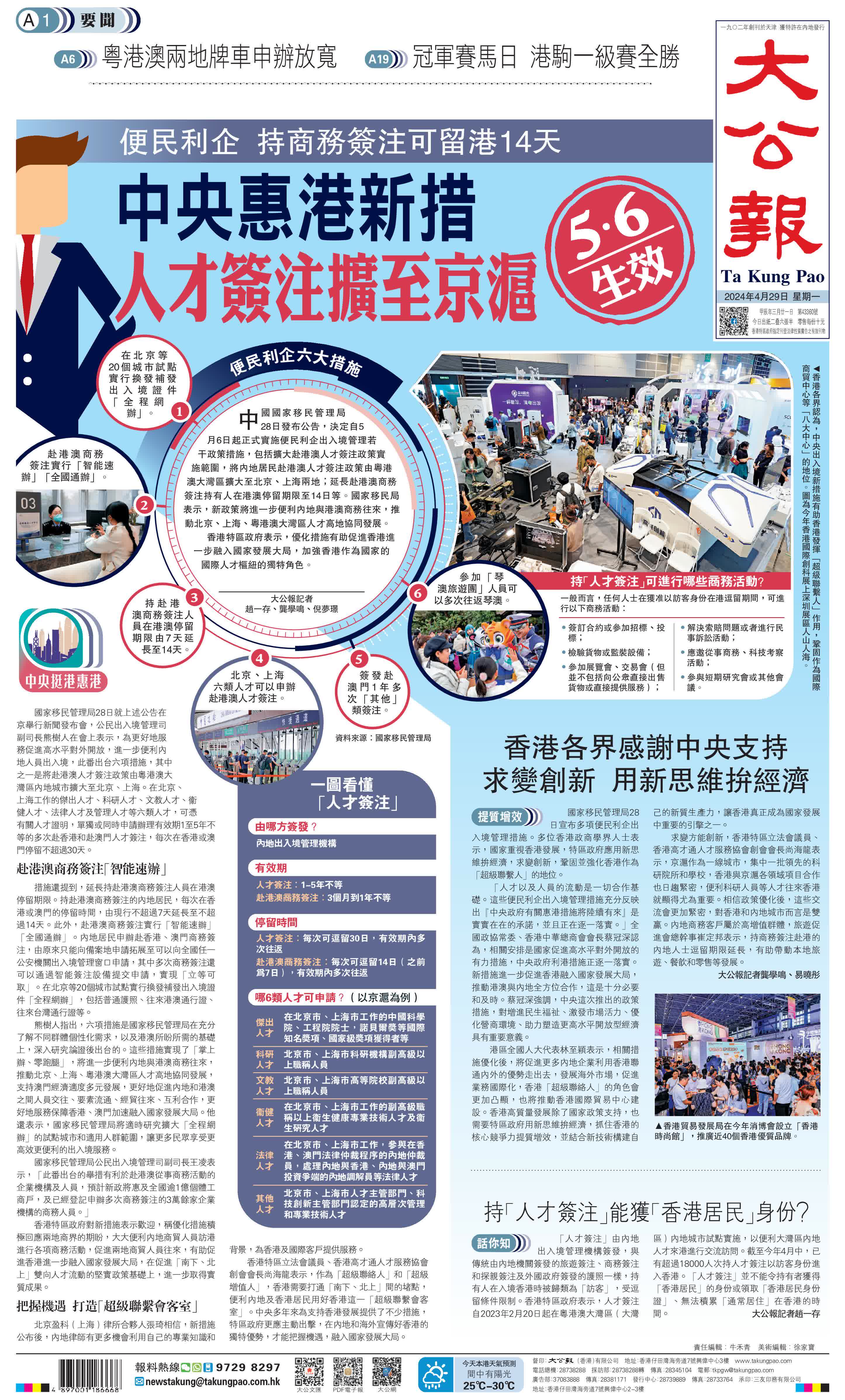 (大公報記者 趙一存、龔學鳴、倪夢璟)中國國家移民管理局28日發布公告,決定自5月6日起正式實施便民利企出入境管理若干政策措施,包括擴大赴港澳人才簽注政策實施範圍,將內地居民赴港澳人才簽注政策由粵港澳大灣區擴大至北京、上海兩地;延長赴港澳商務簽注持有人在港澳停留期限至14日等。國家移民局表示,新政策將進一步便利內地與港澳商務往來,推動北京、上海、粵港澳大灣區人才高地協同發展。