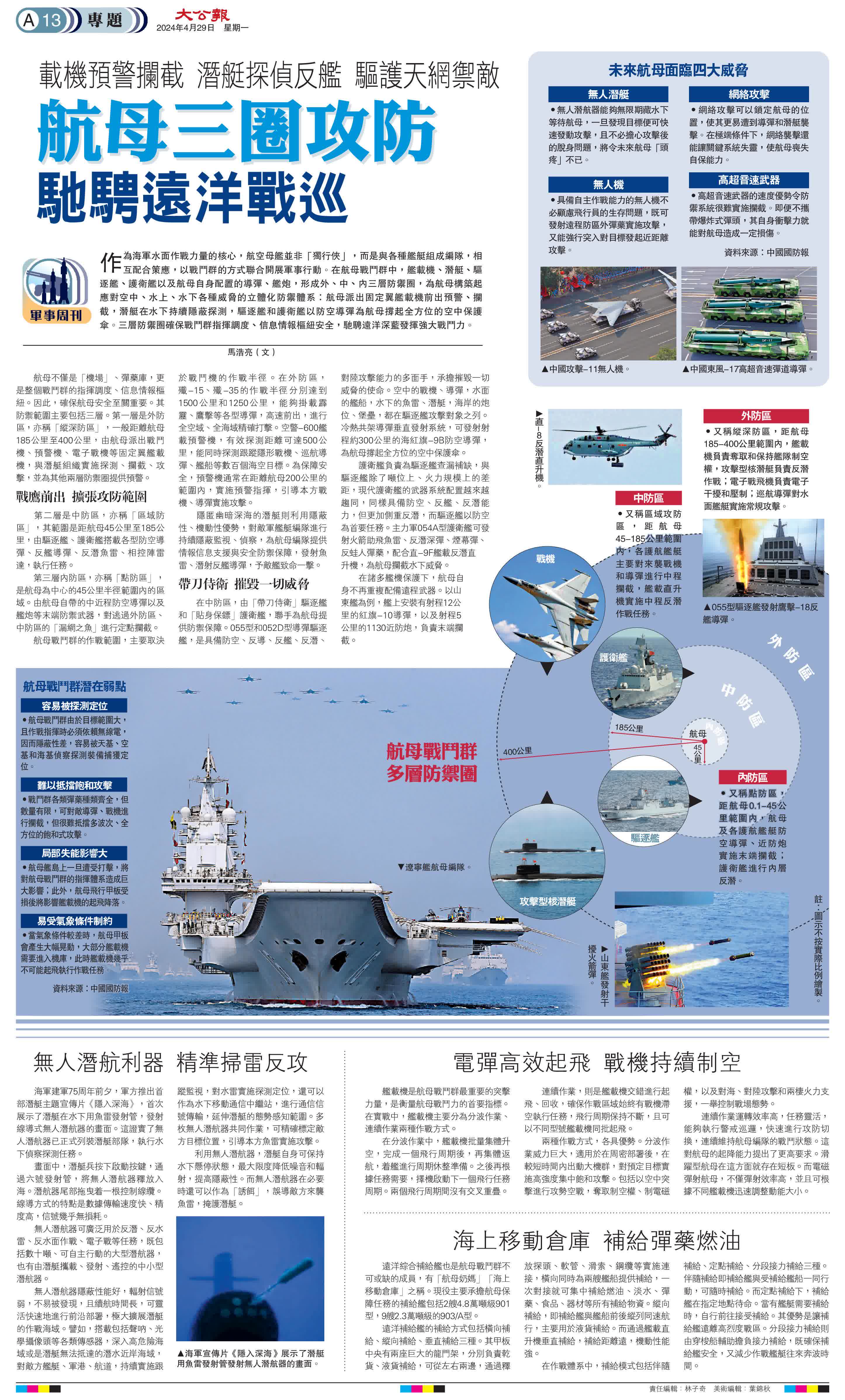 航母不僅是「機場」、彈藥庫,更是整個戰鬥群的指揮調度、信息情報樞紐。因此,確保航母安全至關重要。其防禦範圍主要包括三層。第一層是外防區,亦稱「縱深防區」,一般距離航母185公里至400公里,由航母派出戰鬥機、預警機、電子戰機等固定翼艦載機,與潛艇組織實施探測、攔截、攻擊,並為其他兩層防禦圈提供預警。