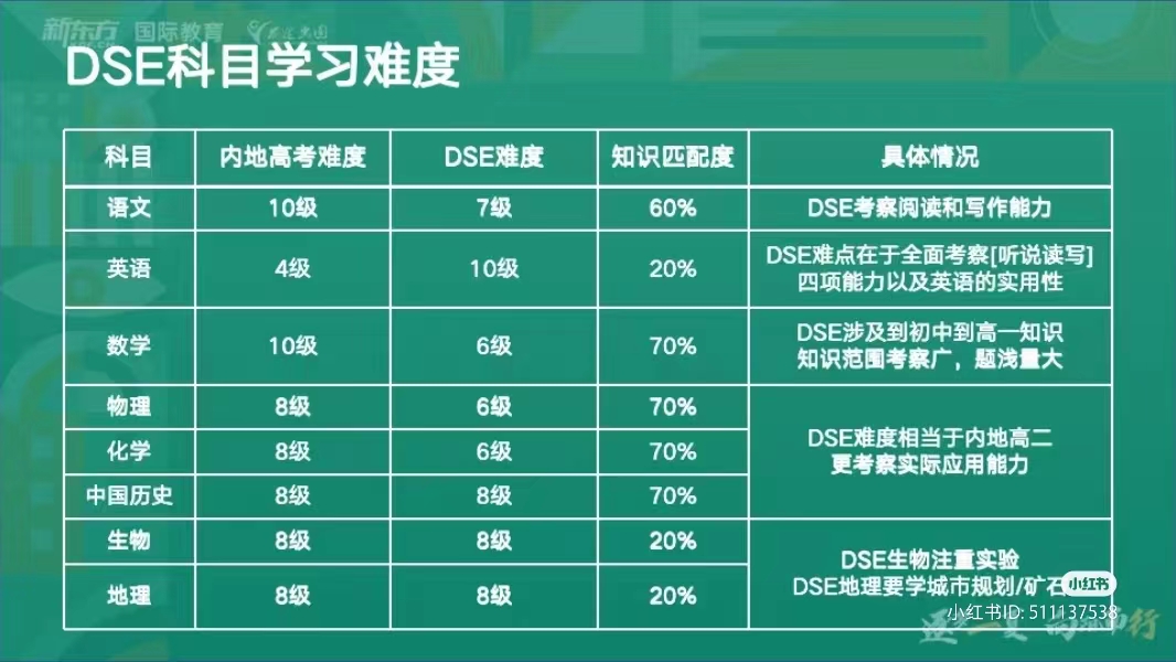 內地學生普遍認為,來港後最需要補習的科目是英文。若將考試難度按等級劃分,內地高考的英語難度等級為4,香港DSE英文考試的難度可達10,相差懸殊,且香港的英語考試涉及到聽、說、讀、寫等全方位的能力,和內地側重讀寫的書面答卷又顯示出能力要求上的差異。
