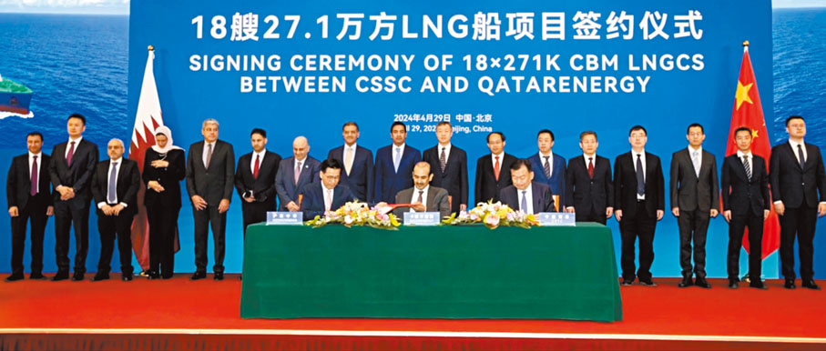 中國船舶集團董事長溫剛當日表示,多年來,中國船舶集團與卡塔爾能源建立並保持了良好的合作關係,攜手推動能源產業綠色低碳轉型發展。此次雙方再度攜手,中國船舶集團將集中優勢資源,精心組織生產,加強科學管理,着力打造業界精品工程、標杆工程,確保按期保質交付,為卡塔爾能源加快擴產轉型發展提供有力支撐,為中卡兩國經濟合作打造新典範、作出新貢獻。