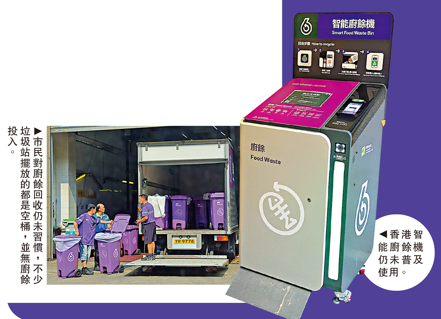 就廚餘回收問題,環保署曾回覆《大公報》表示,「私人屋苑智能廚餘回收桶試驗計劃」接受超過1000戶的屋苑申請智能廚餘回收桶,即平均1000戶共用一個容量120公升的廚餘桶(重約0.12公噸)。然而根據2022年《香港固體廢物報告》的資料推算,以一個三人家庭每日平均產生的廚餘量約0.95公斤計算,即每部120公升廚餘桶每日最多可接收126戶的廚餘,佔1000戶的12%。若要提高廚餘回收率,即平均1000戶最少需要設置8個120公升廚餘回收桶,全港則需逾2.1萬個廚餘回收桶。然而,目前只有約900個分布全港的收集點,根本是杯水車薪。