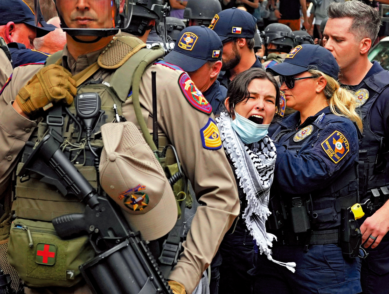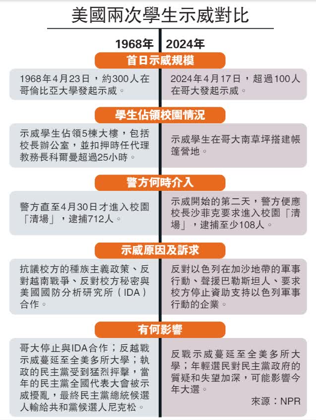今年美國大學反戰示威爆發後,警方進入校園「清場」的速度比1968年反越戰運動期間更快,被捕學生面臨停課甚至開除的嚴厲懲罰。校方對學生自由的限制,令參與示威的學生感到震驚,並引發反彈。