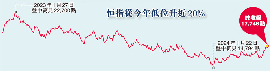 鉅亨證券業務發展副總裁袁志峰指,近日市場氣氛熾熱,恒指多日累漲逾1,500點,上周更創近13年最大的單周漲幅,成交額也創近9個月新高。截至昨日,港股較1月份低位已累升約兩成,幾可宣布進入技術性牛市。雖然港股短期有回吐壓力,但並不影響升勢的延續,事實上,除了「北水」陸續進駐港股外,外資亦已偷步進場,故他預期港股短線可升穿並企穩18,000點。